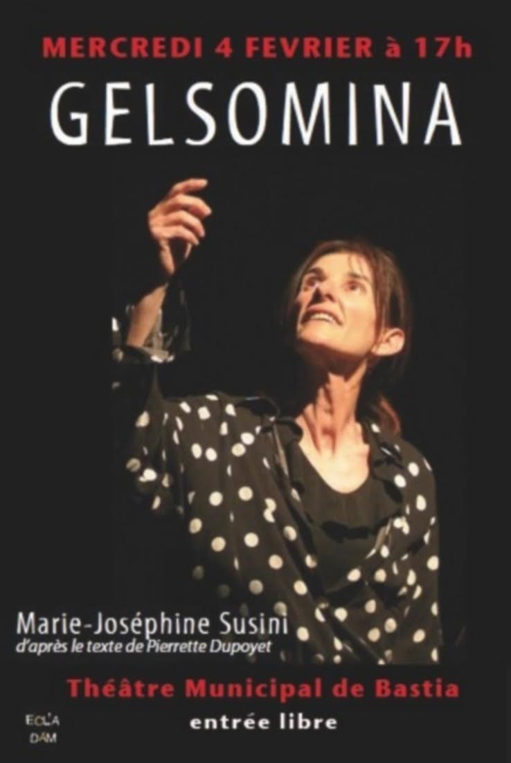 Au sein de la compagnie théâtrale "ECL'ADAM" pour Gelsomina, Marie-Joséphine Susini est responsable de la mise en scène et du jeu, et se produit seule tenant le rôle de plusieurs personnages, dans un décor sobre, très minimaliste. Mais il n'est pas besoin d'un décor somptueux pour donner corps au texte et au jeu tout en subtilité et délicatesse de Marie-Joséphine Susini.