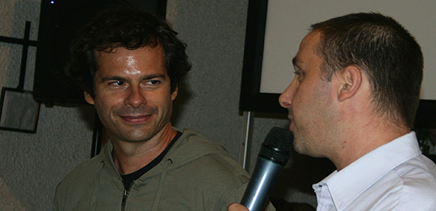 Frédéric Farucci (à gauche) interviewé par Olivier Balbinot lors du festival de Murato