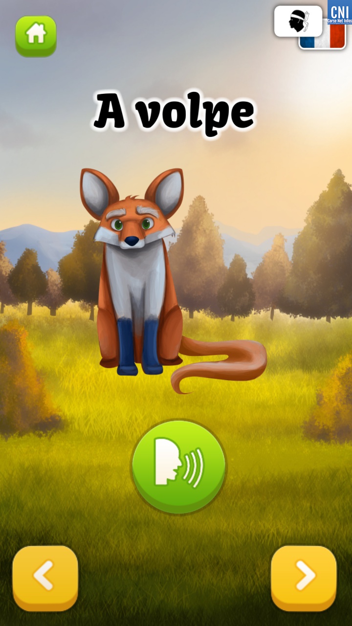 Des images sont présentées dans l'application, accompagnées d'un titre dans une langue donnée et d'un bruitage correspondant à chaque image. La prononciation de chaque image se fait dans une langue par défaut, par exemple le Corse. L'enfant peut changer à tout moment de langue en appuyant sur un petit drapeau, de manière à entendre la langue secondaire, par exemple le français.