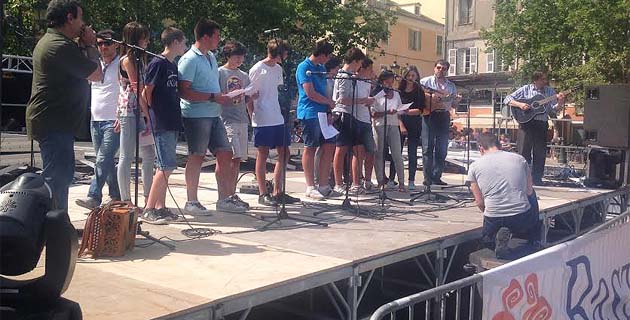 Cette infusion de la langue corse dans les réseaux de la Ville s'est terminée par un grand rendez-vous donné sur la place du Marché, vendredi en début d'après-midi. Là se sont retrouvés près de trois cent élèves pour mettre leurs mots et leur enthousiasme en chœur et les offrir à la population.