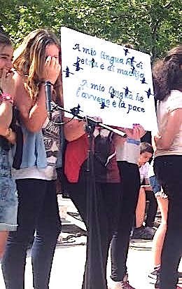 En effet, près de 1 500 élèves du premier et du second degrés se sont mobilisés pour sortir de leur école ou de leur collège. Ils se ont éparpillés dans la ville et ont investi les espaces publics où ils ont égrené chansons et poèmes et les mots s’évadaient vers les passants, vers les curieux, vers leurs parents tous conquis par la fraicheur de ces moments offerts par leurs enfants, sans aucun doute aussi par le mystère insondable qui les réunit autour de la langue corse, par la connivence qu’elle installe spontanément entre les êtres et les résonnances qu’elle éveille en eux.