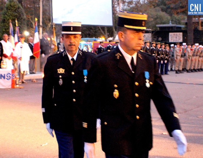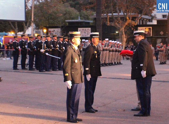 Après la revue des troupes composées d'un peloton de l'escadron de Gendarmerie 25-3 de Cherbourg et de deux sections du 2e rep de Calvi, effectuée par le lieutenant-colonel Biancardini, délégué militaire départemental, et le lieutenant-colonel Thomas, commandant des troupes, le colonel Olivier Pezza, commandant le groupement de gendarmerie de Haute-Corse a remis les insignes de chevalier de l'ordre national du Mérite aux commandants Paulo de Carvalho, commandant la compagnie de gendarmerie de Calvi et Philippe Grimaud.