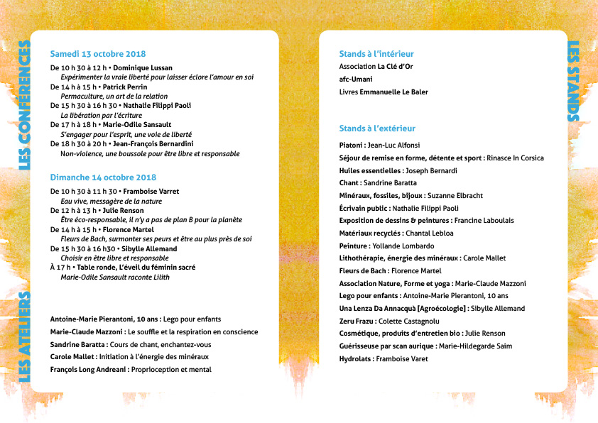 Cette édition verra la participation de nombreux conférenciers tels que Dominique Lussan, Jean François Bernardini, Patrick Perrin, Marie Odile Sansault, Nathalie Filippi-Paoli, Framboise Varret, Julie Renson, Florence Martel, Sibylle Allemand sur ce thème. Conférences mais aussi ateliers : lego pour enfants, cours de chants, souffle et respiration, énergie des minéraux, proprioception et mental…