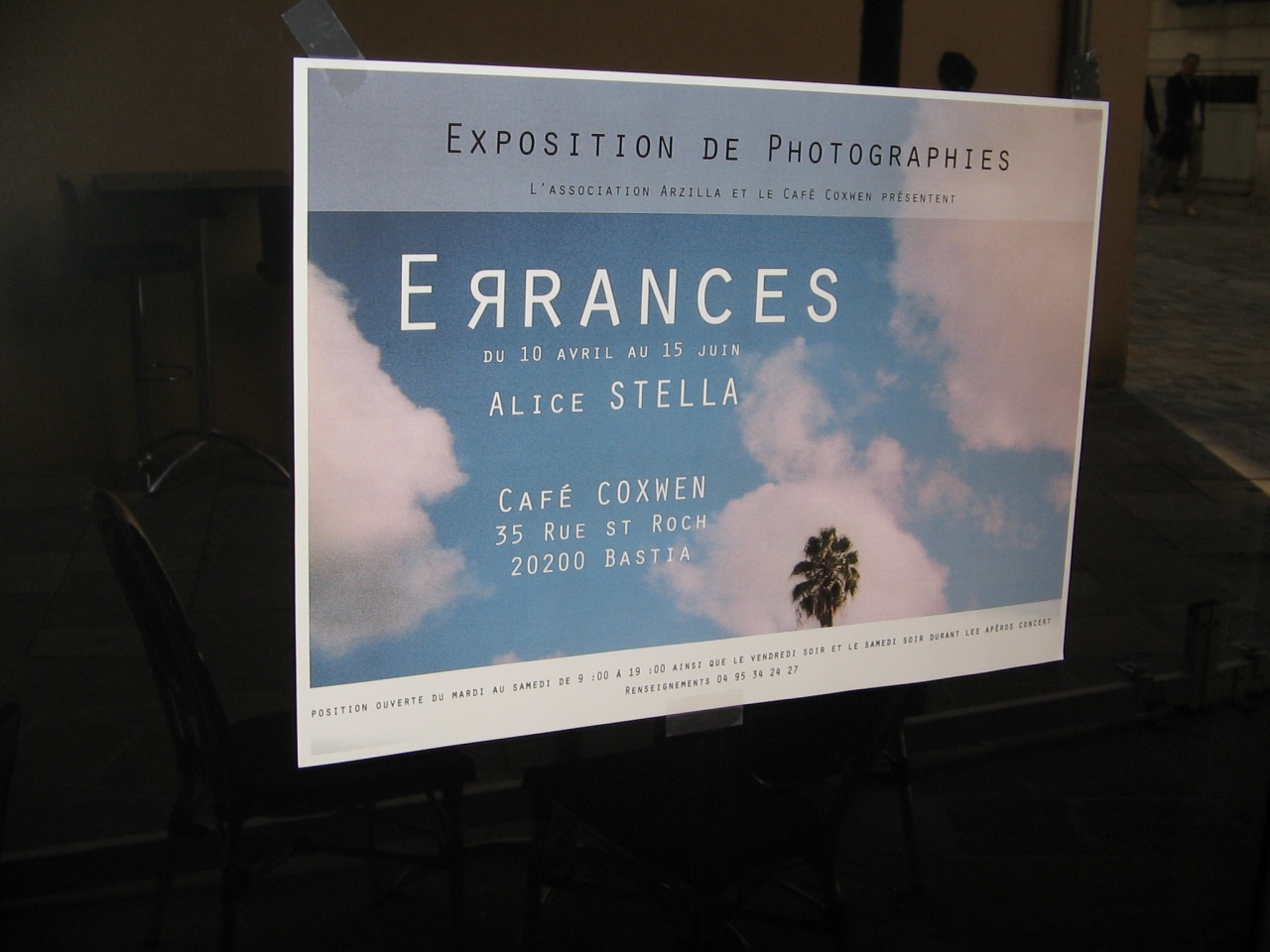 « J’ai intitulé cette exposition Errances, avec un « R » retourné pour signifier l’impermanence des choses, leur bouleversement ou leur détournement si l’on peut dire. Ces photos prises entre Corse, Inde, Angleterre, Paris et la Californie témoignent d’un chemin d’évolution parcouru au gré de mes promenades » explique Alice Stella sur le sens de cette exposition. Entièrement autofinancée, l’exposition a été soutenue par le CoxWen, les proches de l’artiste et le domaine E Petre d’Aleria qui a fourni vin rouge et rosé pour la soirée du vernissage. Dans une ambiance jazzy signée DJ Jacha, le buffet généreux et original proposait gigot de sanglier, tartes aux blettes sauvages ou encore fondant au chocolat.