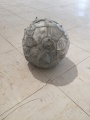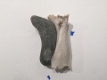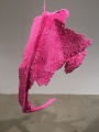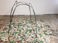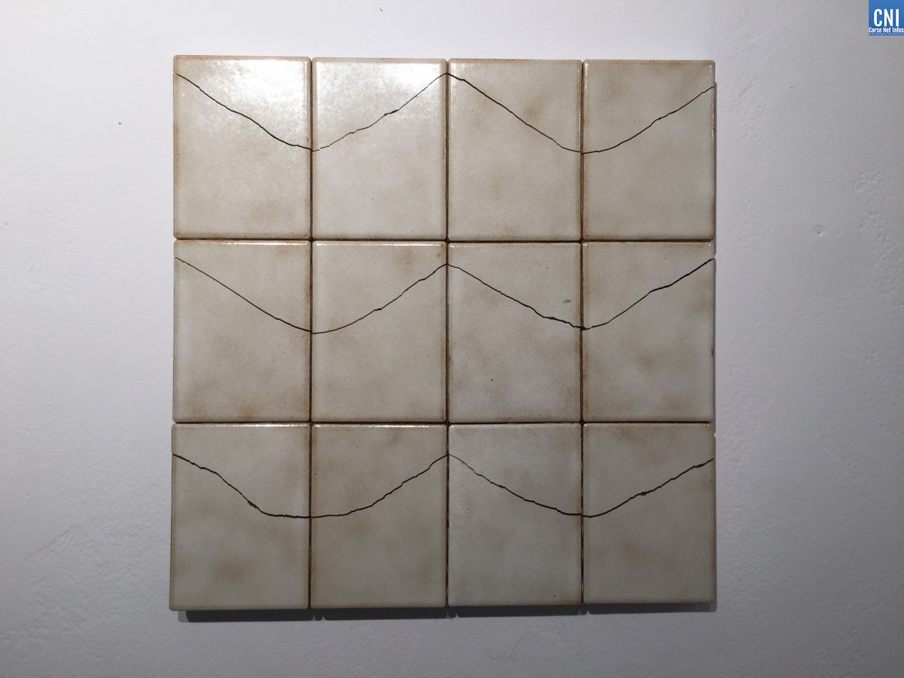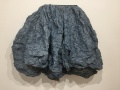 Dans la première salle, on entre d’abord dans une salle carrelée blanche, un sorte de sas dans laquelle « coup sur coup » mêle rigueur géométrique, répétition tactile et pur hasard, un paradoxe entre accidents fissurés et forme mathématique. Puis en s’avançant sur le sol foncé des pierres de lauze laissées brutes en surface, une ambiance pétrole assemble plusieurs œuvres. « Le maquis » est une toile de tente au motif camouflage dont seule reste l’ossature dénudée et ramollie. Le sol est jonché du motif coloré vert, noir et argent, qui a été méticuleusement découpé, motif par motif et soustrait de sa structure, retombants par terre, comme le feuillage dispersé d’un humus. Faux semblant et apparences de textures et de matière, le motif camouflage trouve son origine dans le regard du peintre sur le paysage, sa représentation et sa possible abstraction. « L’or gris », accroché au mur, sur son étalon, est un sac poubelle noir et vert qui a été patiemment étiré, détendu dans son entier. Transfigurant la matière plastique en une sorte de coquillage, de forme apparemment naturelle et organique.