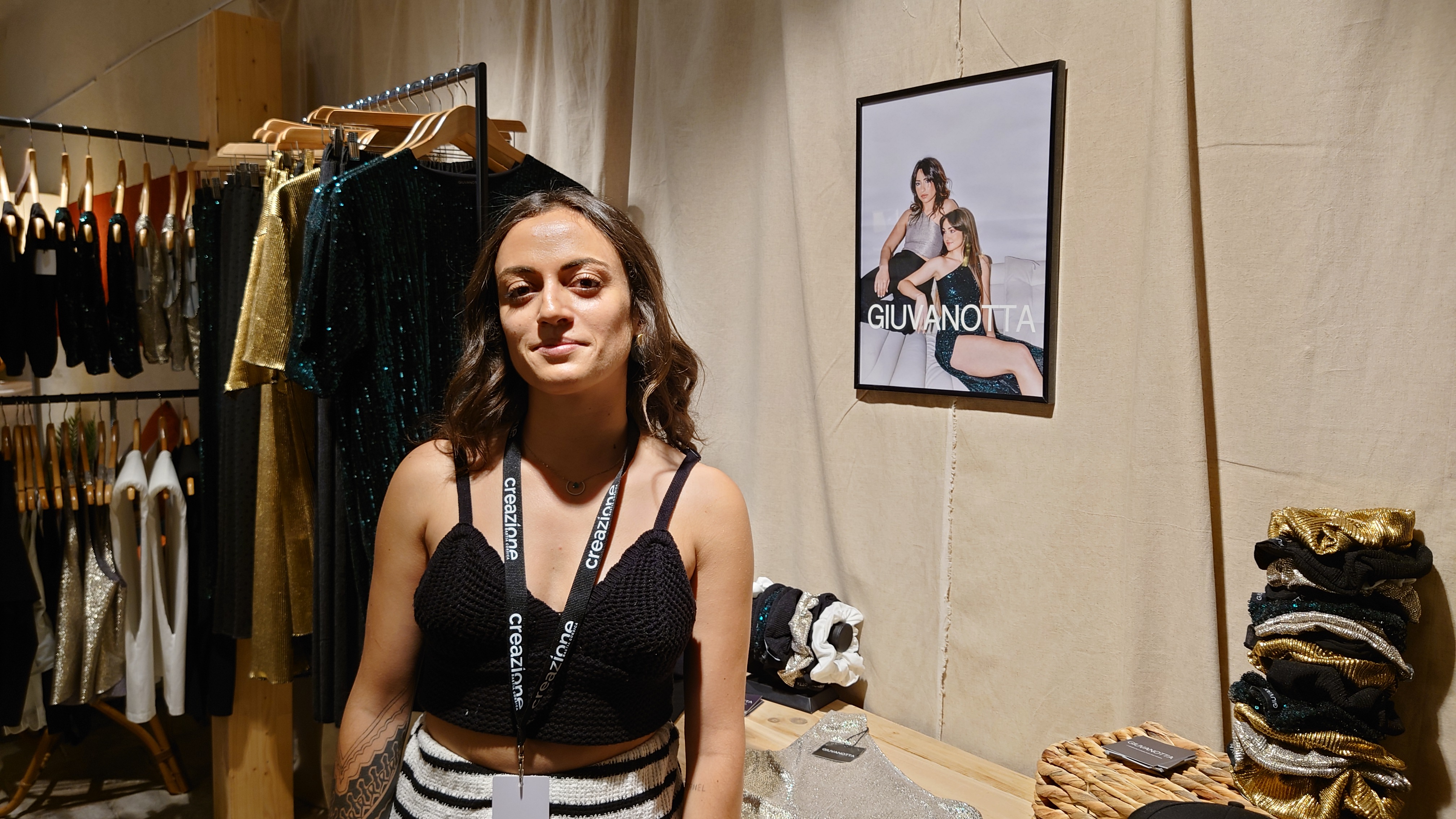 À seulement 27 ans, Olivia Dinelli est l'un des jeunes talents prometteurs présents à Creazione. Il y a six mois, elle a fondé sa propre marque de vêtements pour jeunes femmes, Giuvanotta, qui fait déjà sensation dans le monde de la mode. Passionnée et audacieuse, elle apporte une touche de rock et de modernité à travers ses créations. "Giuvanotta est une marque qui incarne le style rock et fashion. Je travaille principalement avec des teintes noires et blanches, ainsi que des couleurs pailletées telles que l'or et l'argent. Chaque pièce a sa propre étiquette à l'intérieur et porte un nom unique", explique Olivia.