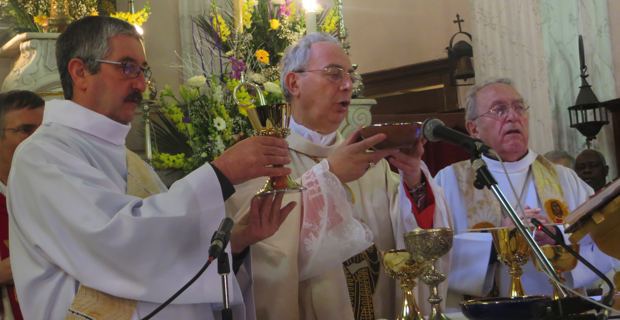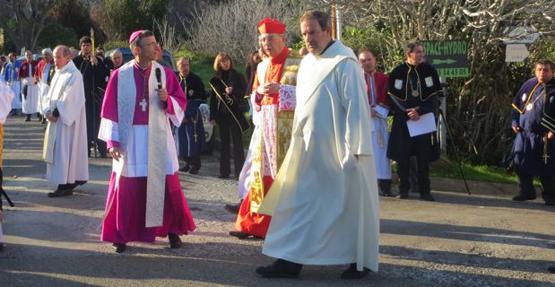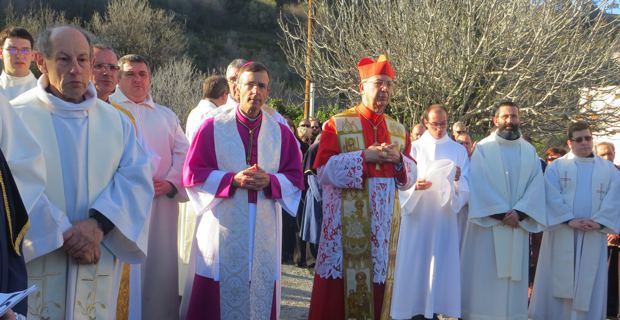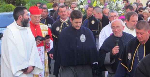Le Cardinal Dominique Mamberti, l'évèque de Corse et les confrères de San Ghjisè à Bastia.