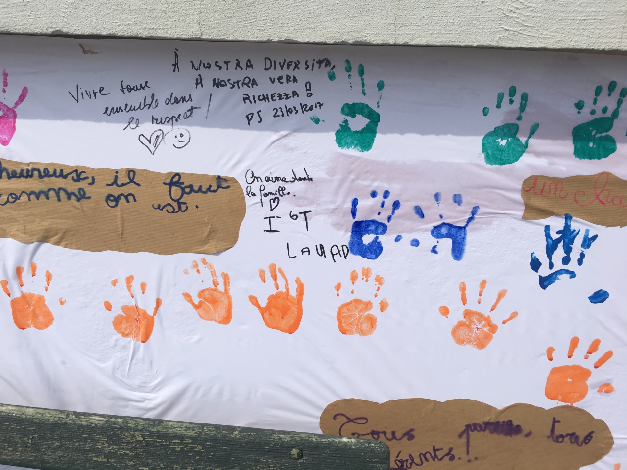 Ce sont en effet des dizaines de petites mains qui sont venues laisser leurs empreintes multicolores sur les murs de l’école Campanari de Bastia. Autour d’elles, des phrases sur le thème de la diversité ont été écrites par les parents, le maire de Bastia Pierre Savelli, l’adjointe déléguée à la politique éducative et à la jeunesse Ivana Polisini et les représentants de l’académie de Corse.