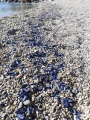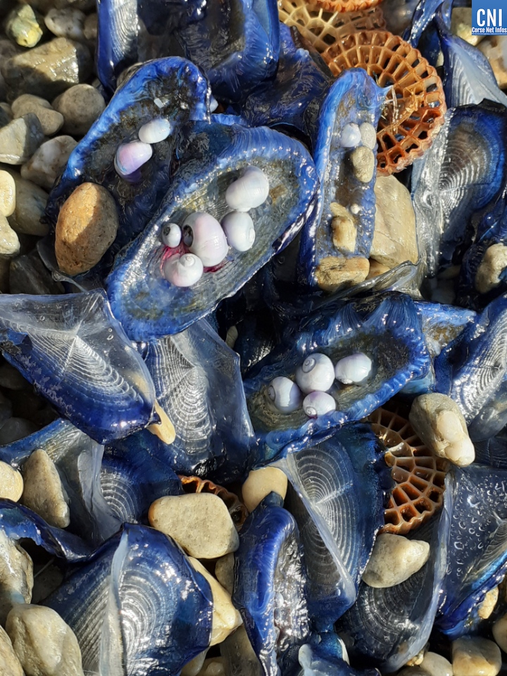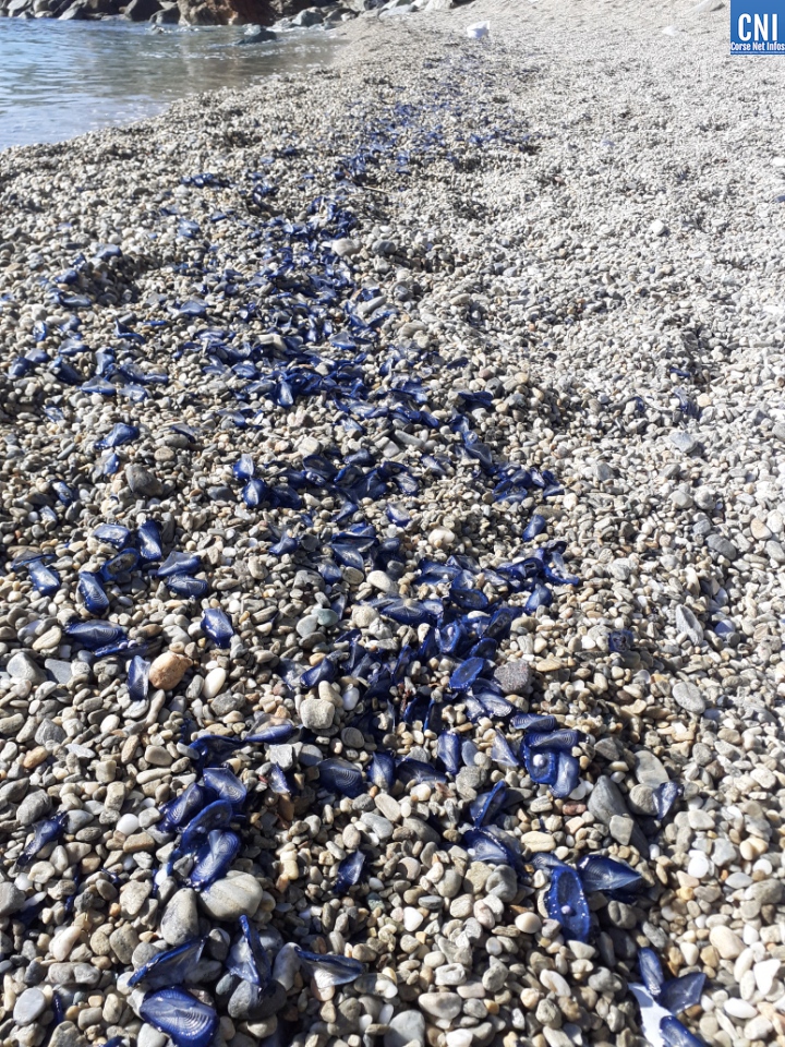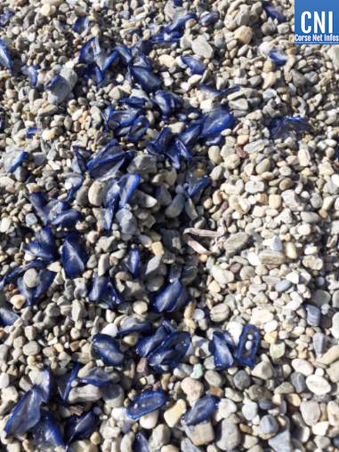 La vélelle (Velella velella), contrairement aux apparences n’est pas une méduse mais, comme elle, fait pas partie de la famille des cnidaires. Elle se présente sous la forme d'un anneau cartilagineux bleu/mauve de forme ovale, de 6 cm de longueur maximale. Contrairement à la méduse, elle ne provoque pas d'urticaire chez l'humain. Les colonies de vélelles ne peuvent se mouvoir d'elles-mêmes et c'est le vent qui décide de leur déplacement. Les forts courants de Nord-est de ces derniers jours les ont fait échouer sur nos plages.