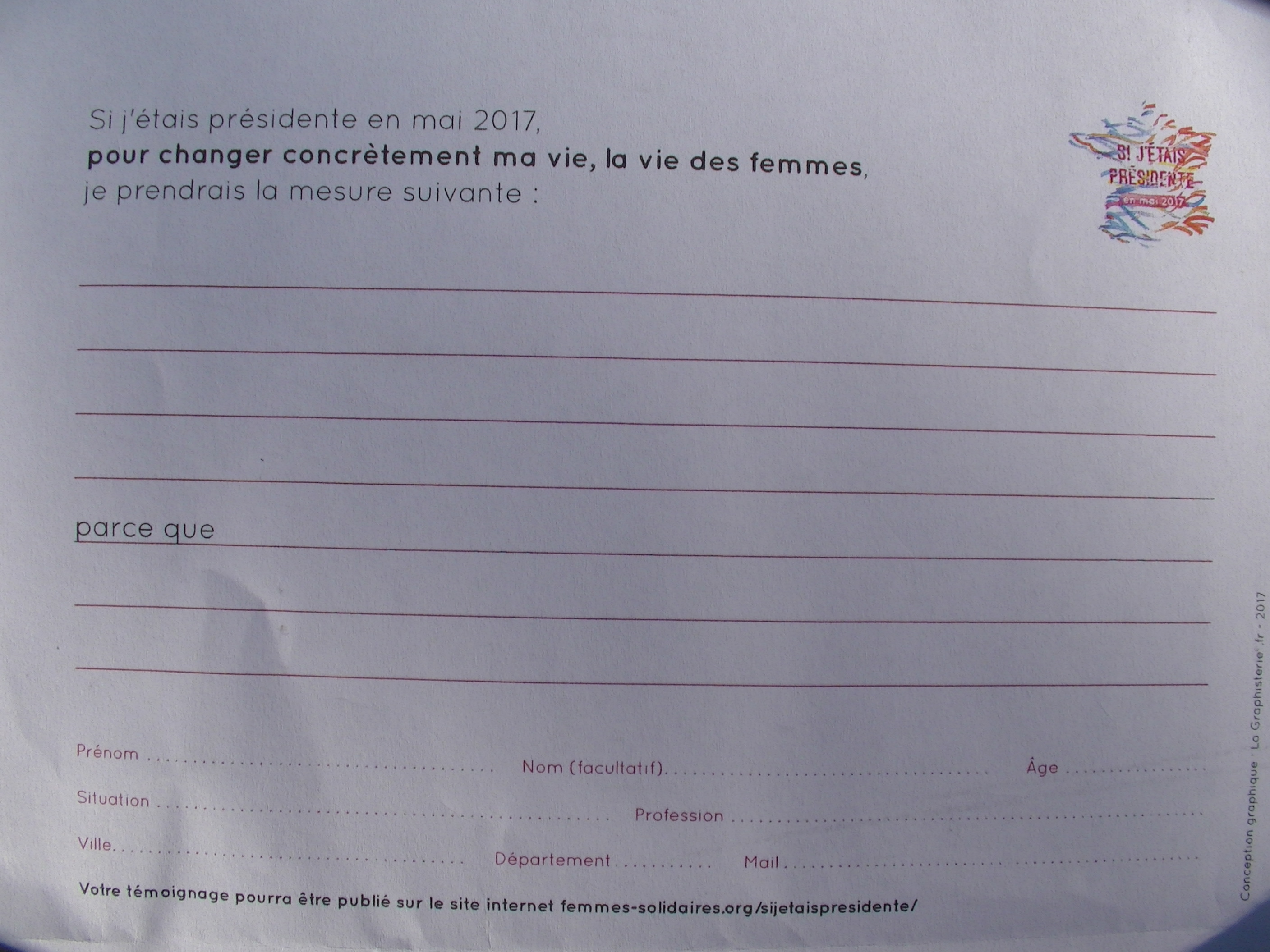 Une action féministe d'éducation populaire, une action de terrain en proximité avec les femmes, une campagne intitulée "Si j'étais présidente en mai 2017, pour changer ma vie, la vie des femmes, je prendrais la mesure suivante...".