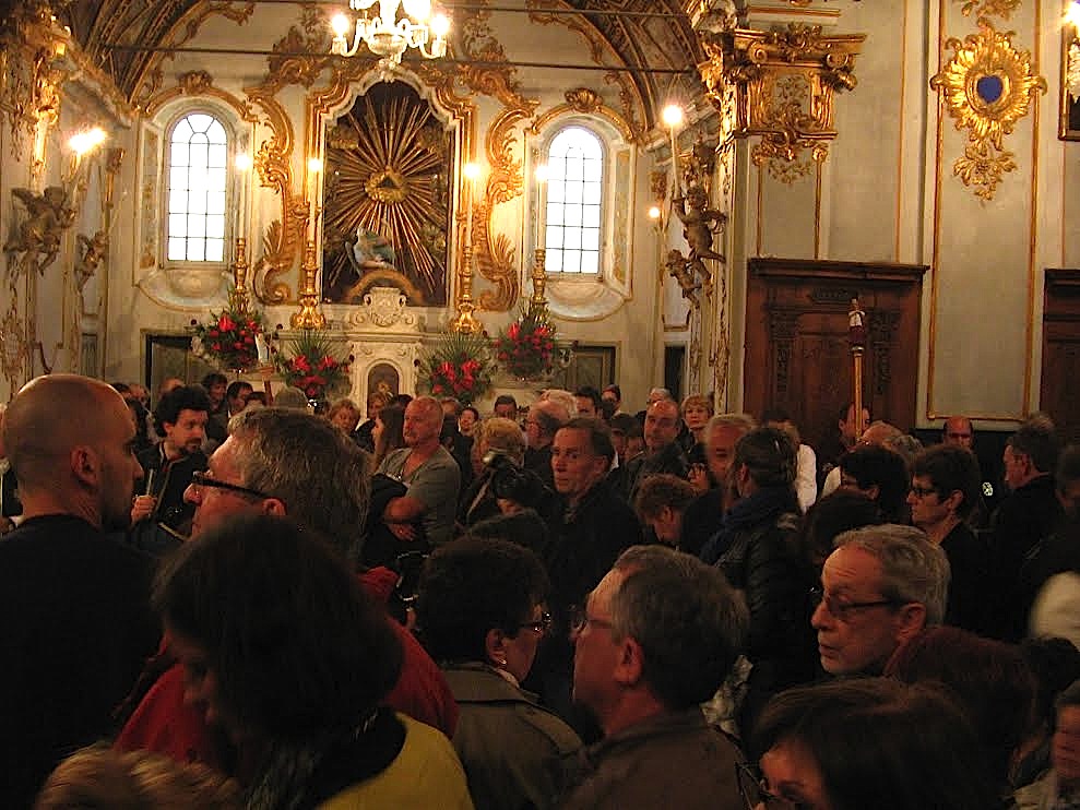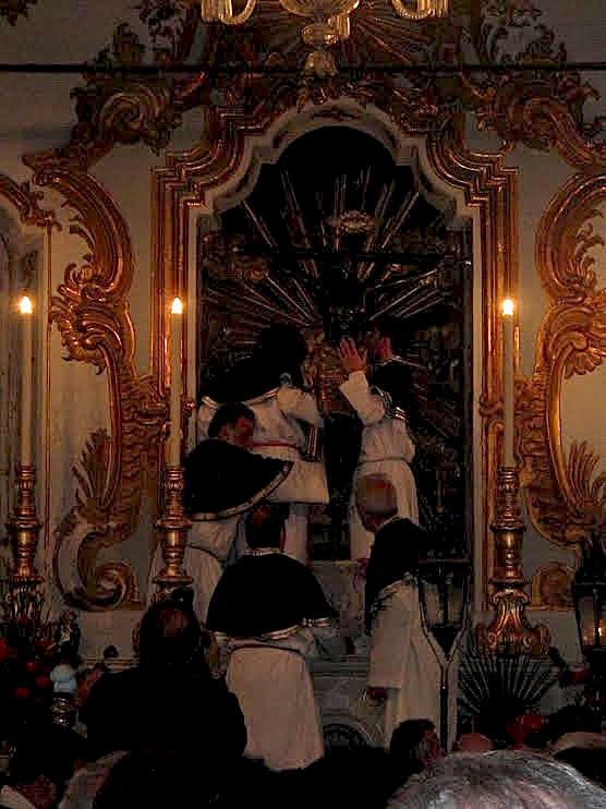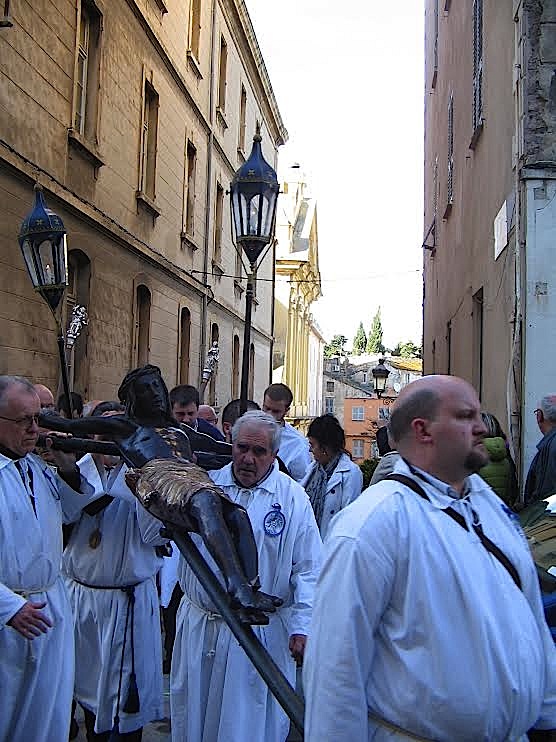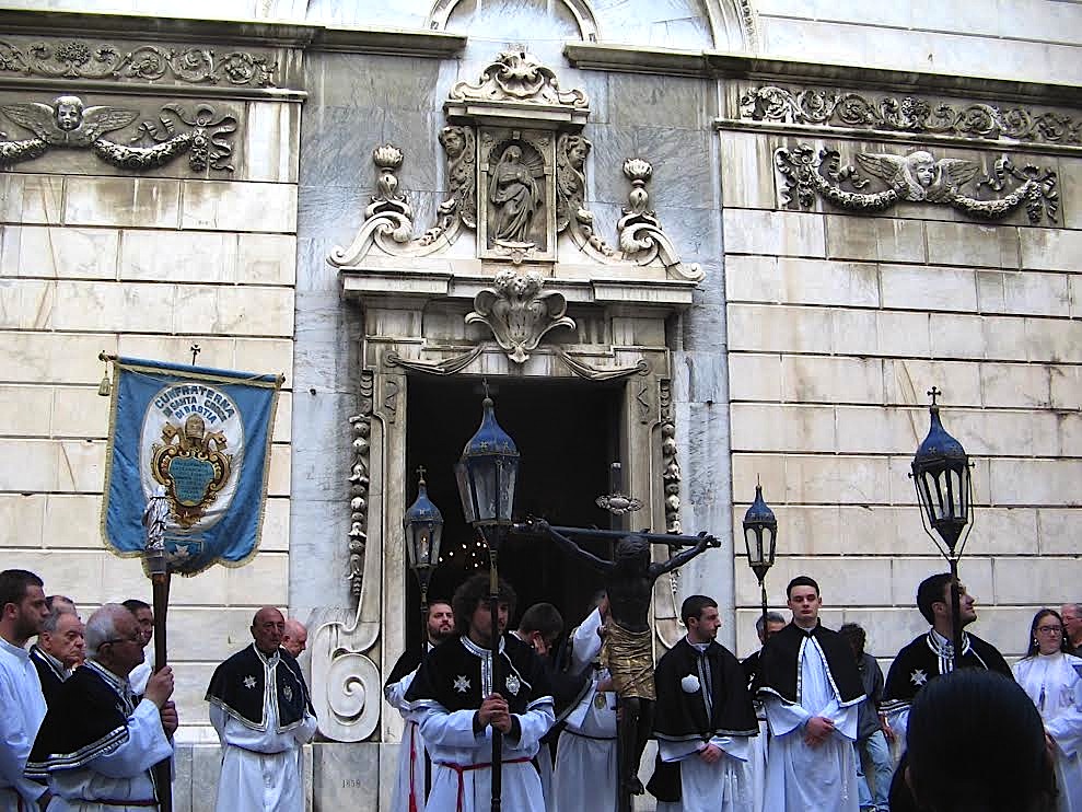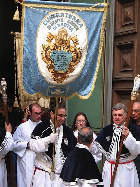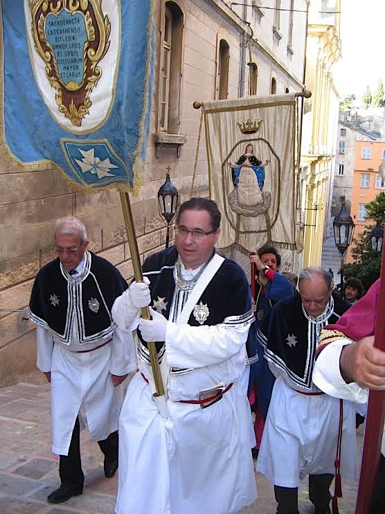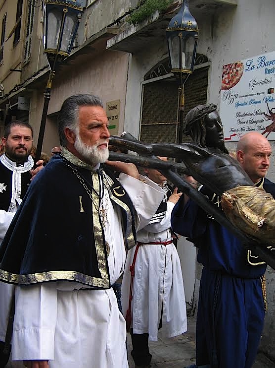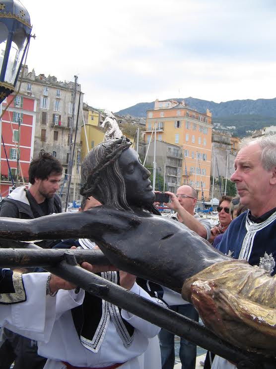 Santa Croce, Saint-Roch, Saint-Joseph, Muro, San Martinu di Patrimonio, Pontremoli (Toscane.Italie), nombreuses étaient les confréries à rendre hommage au Crucifix des miracles à Bastia autrement désigné Christ Noir. Georges de Zerbi, administrateur de la confrérie de Santa Croce nous explique l’origine de cette célébration : « La fête du Christ Noir a lieu traditionnellement tous les trois ans à Bastia. Depuis 1991, notre confrérie commémore le 3 mai la découverte de ce crucifix avec tous les plaisanciers, les pêcheurs et les bastiais. Le Christ bénit tous ceux dont la mer est un travail, c’est ainsi que nous faisons arriver le Christ par bateau, c’est un Christ qui vient de la mer pour venir sur la terre. »