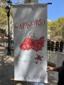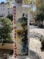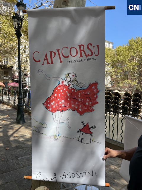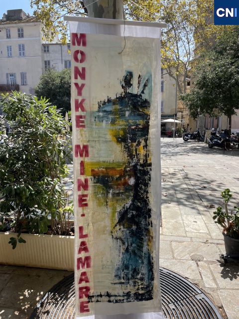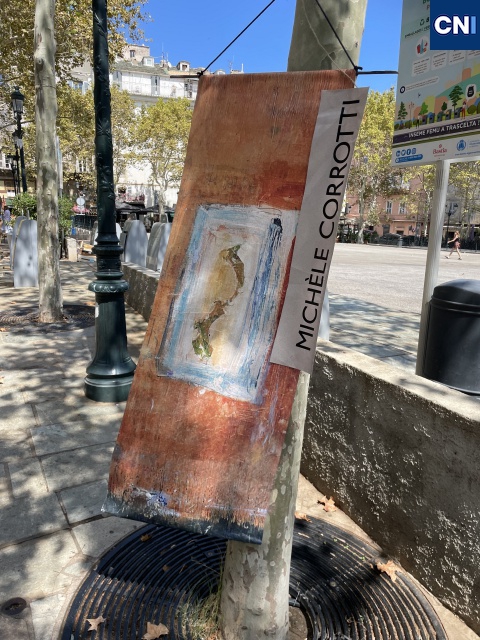 «Cette édition 2024 est dédiée à notre ami Dominique Degli Esposti qui en avait fait partie en 2022 et qui nous a quittés cette année. Les kakémonos* qui sont accrochés sur les arbres, tout autour de la place du Marché, à l’occasion de ce vernissage, ont été réalisés par les artistes qui y participent, peintres, photographes et sculpteurs de toute la Corse, dont une céramiste et le groupe d’Anne Raffalli : La Laisse de mer, 16 artistes sensibles au dérèglement climatique et aux pollutions ».