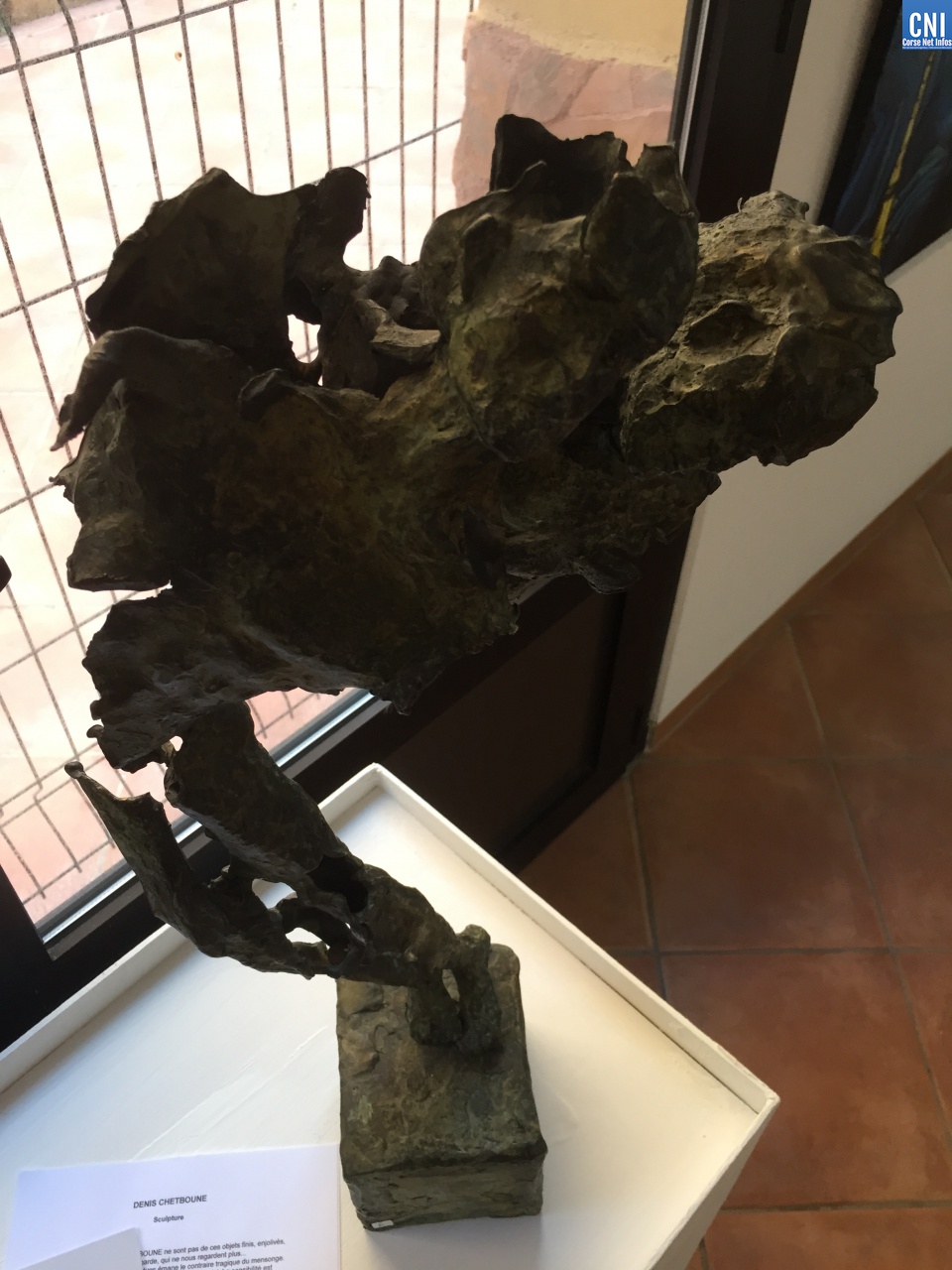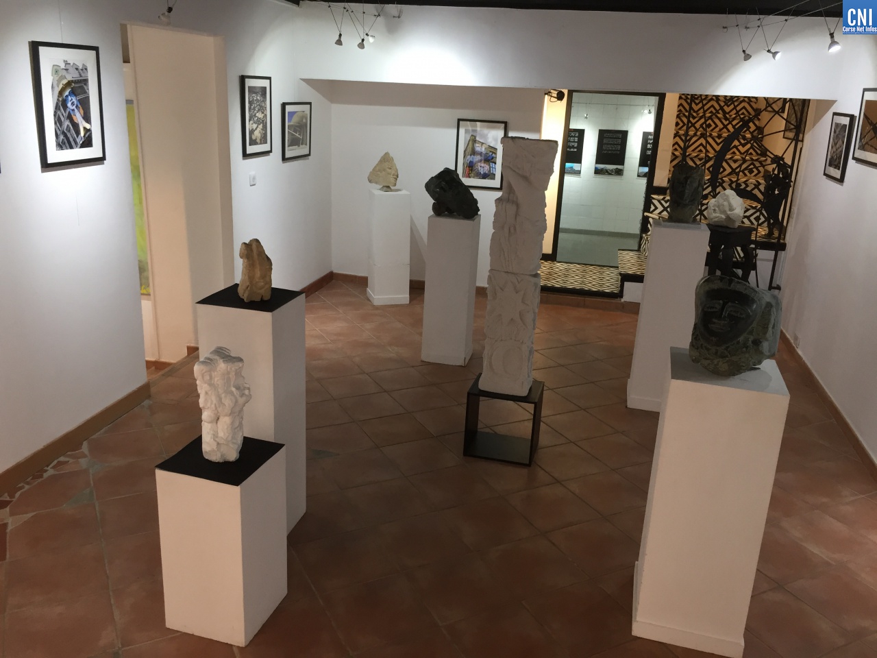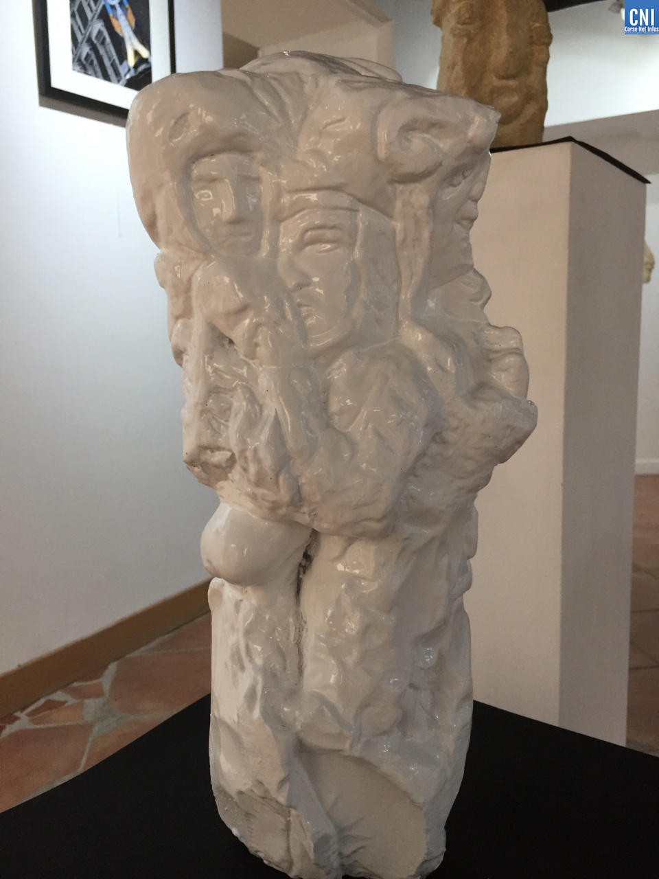 Marie-Hélène Almeras présente de très belles sculptures en pierres de Corse, des pierres qu’elle « tape pour en écouter le chant et laisser son âme en extirper ces visages minéraux et ces totems ».
