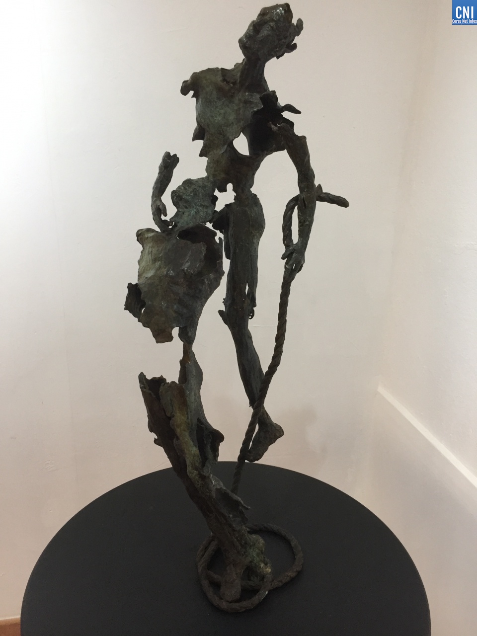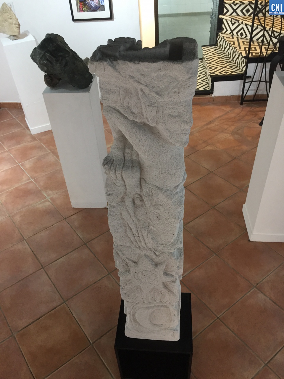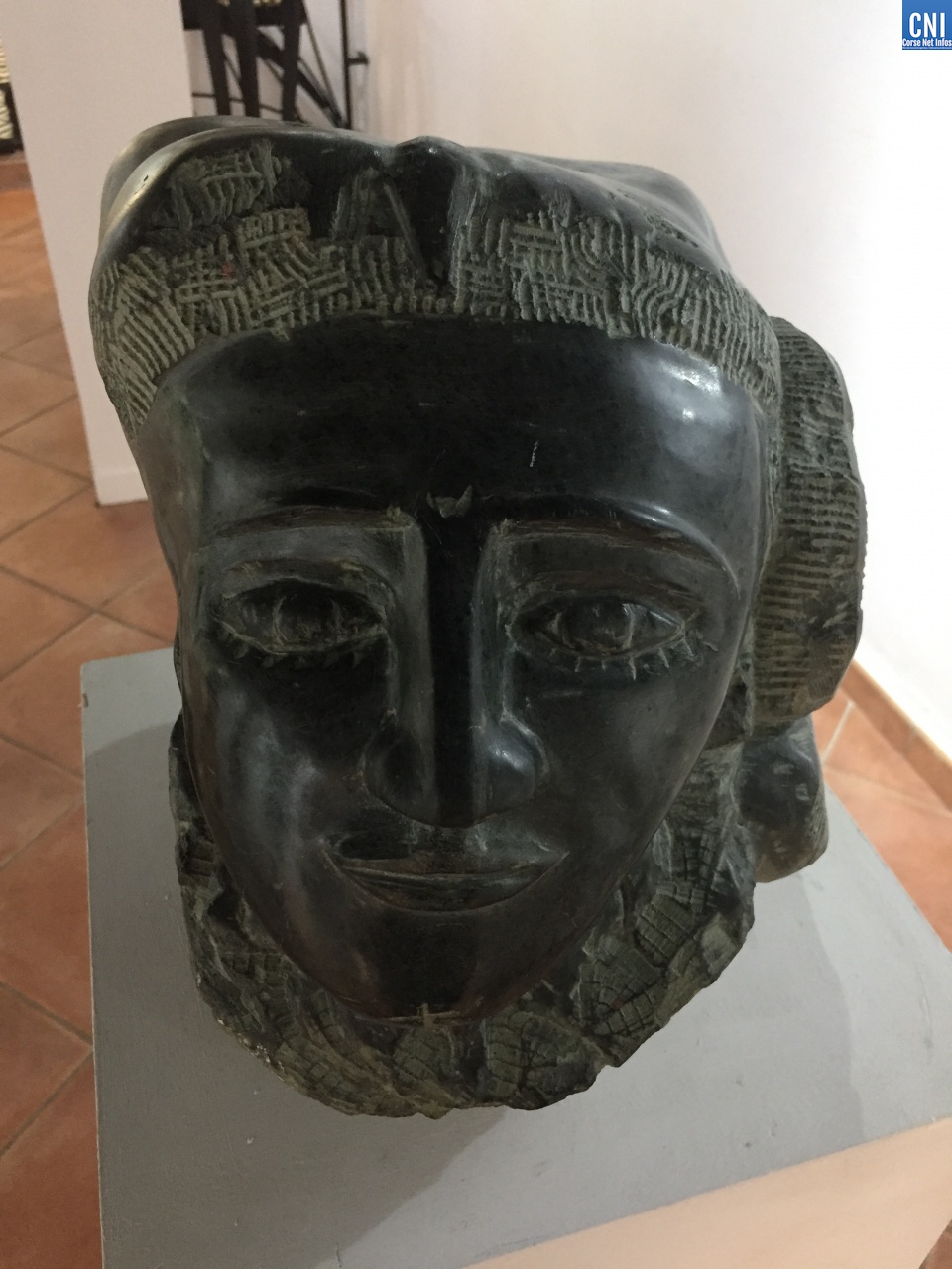 Marie-Hélène Almeras présente de très belles sculptures en pierres de Corse, des pierres qu’elle « tape pour en écouter le chant et laisser son âme en extirper ces visages minéraux et ces totems ».