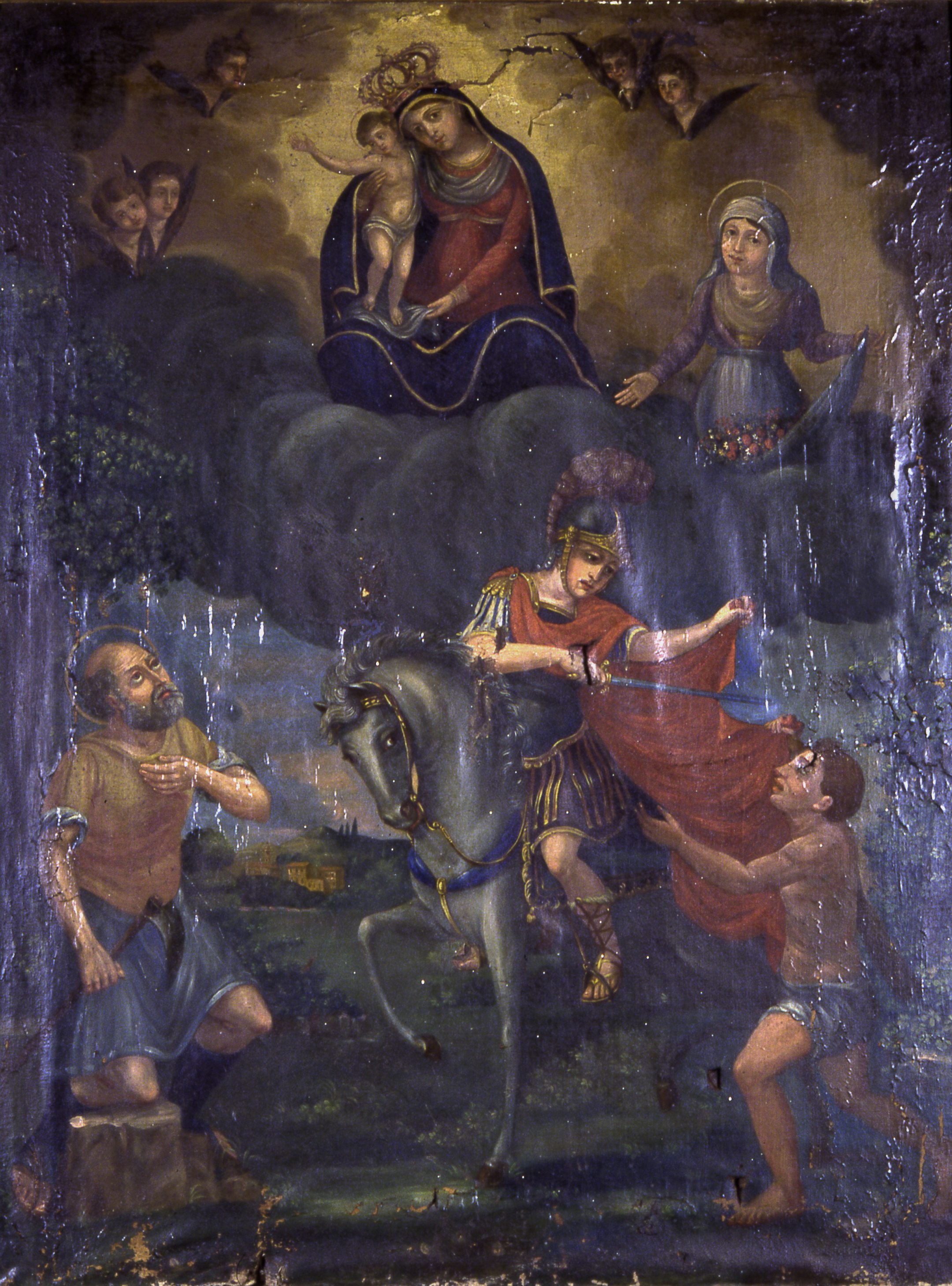 Le tableautin d’autel des vignerons de Terravecchia : La charité de Saint Martin, entouré de Sainte Zita de Lucques, patronne des jardiniers, et de Saint Isidore de Madrid, le laboureur. Peint par Anton Santo Benigni (1787-1863). Sacristie de l’église Saint Roch.