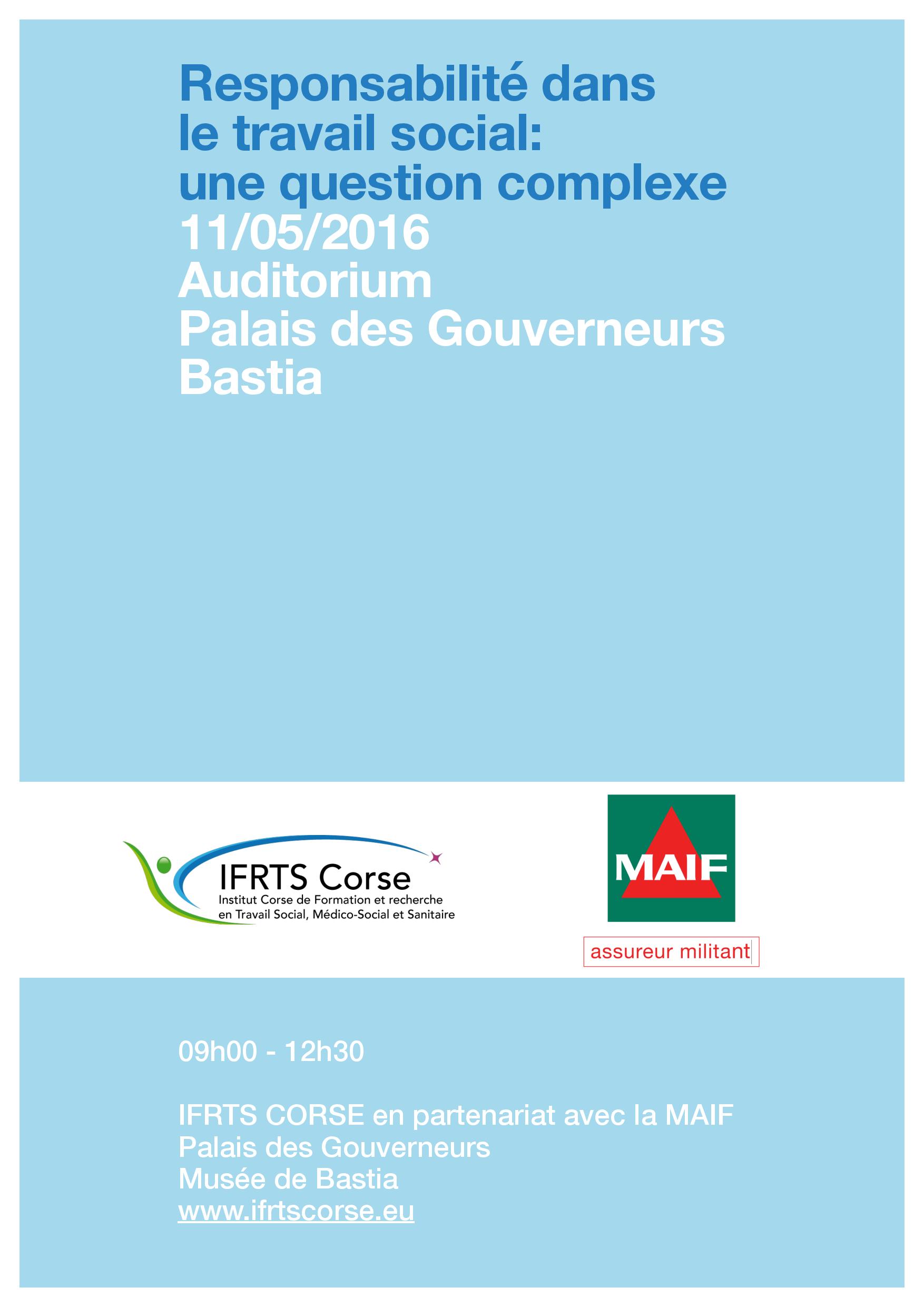 Afin de sensibiliser à cette thématique, l’IFRTS Corse organise, en partenariat avec la MAIF, une conférence sur la Responsabilité dans le Travail Social, le mercredi 11 Mai 2016 à 9h00 au à l’Auditorium du Palais des Gouverneurs de Bastia.