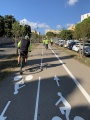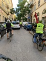 On avale assez rapidement l’avenue Emile Sari (assistance sur 2 !), passage devant la gare, rue G.Peri…. Rue César Campinchi cela se gâte un peu. Un camion de livraison obstrue la voie. Mais en se faufilant on le dépasse et là, miracle. La rue est à nous ! Personne devant, personne derrière. Quelques coups de sonnettes préviennent les piétons de notre passage. «Les piétons ne sont guère habitués à voir circuler les vélos en ville. Comme on ne nous entend pas venir, la sonnette les alerte ». Des pétions «bon enfant» souvent qui nous adressent sourires ou gestes d’amitiés. Le vélo rentrerait-il ou plutôt reviendrait-il dans nos mœurs ? Chouette !