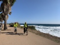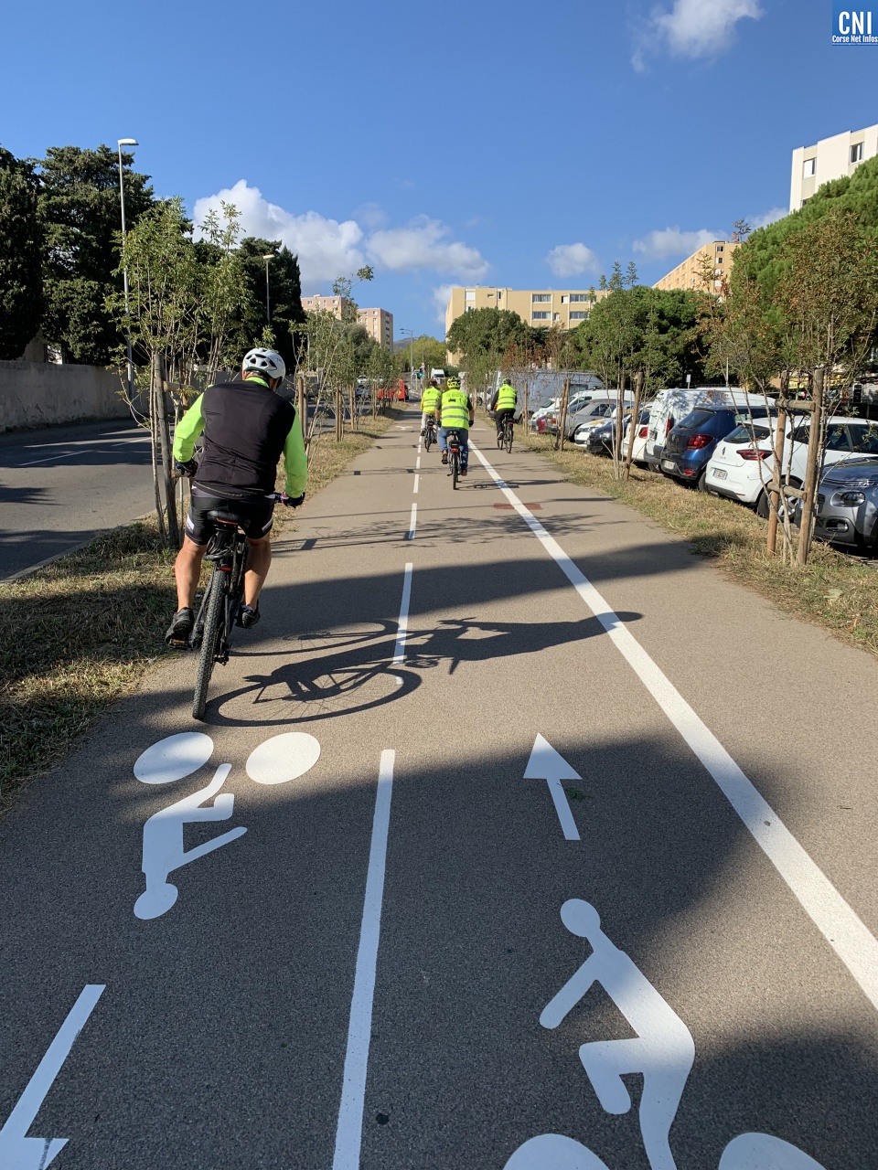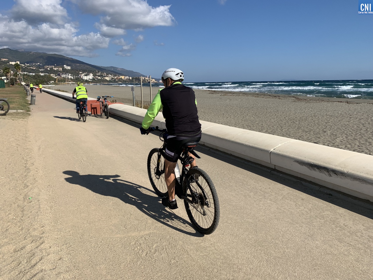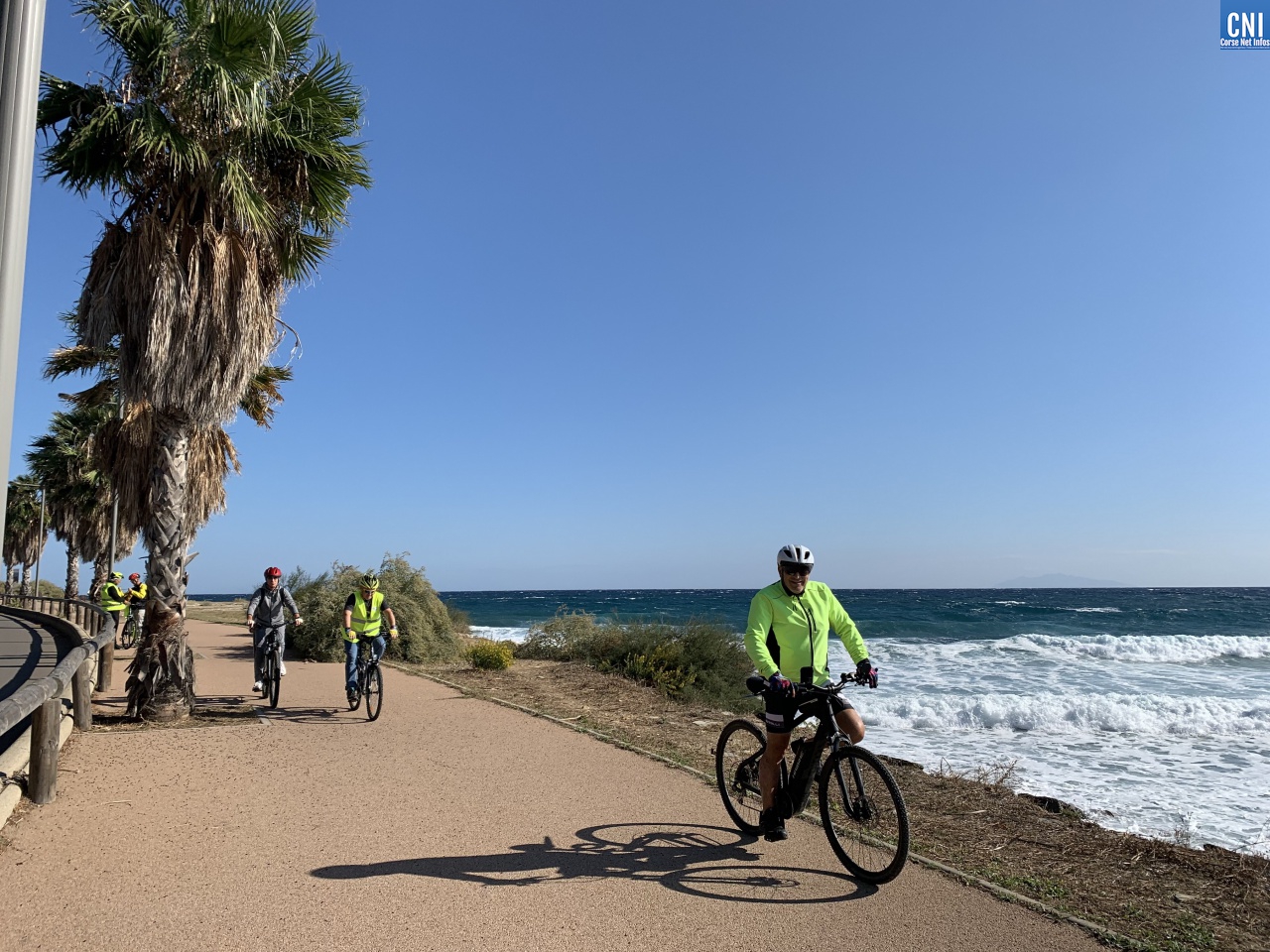 Passage devant la caserne des pompiers, petite grimpette (avec assistance au maximum) pour attendre la piscine de la Carbonite (ce sera la seule difficulté et sur 50 m seulement !). Votre Rouletabille mettra le pied à terre ! Pas assez d’élan ! Jonction avec Notre Dame des victoires, L’Alb’Oru avec un joli passage réservé aux vélos au milieu des pins, Montesoro (un bouton poussoir, il fallait le savoir, est dédié aux cyclistes au feu tricolore !), nouvelle voie cyclable tracée au sol jusqu’au collège et retour à l’Alb’Oru, l’avenue de la Libération puis le Spassimare jusqu’à l’Arinella. Petit tour de la plage sur la piste cyclable et direction l’Aldilonda avec toujours quelques petits coups de sonnette pour prévenir de notre passage. «Les gens qui empruntent le Spassimare pensent souvent à tort qu’il est réservé aux piétons. En fait un panneau indique bien au début que cyclistes et rollers sont autorisés ». Et Gilbert de nous montrer le dit panneau.