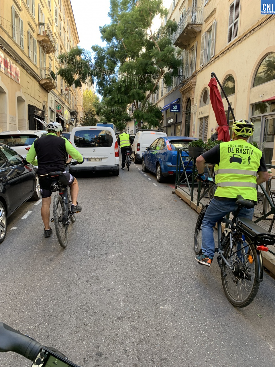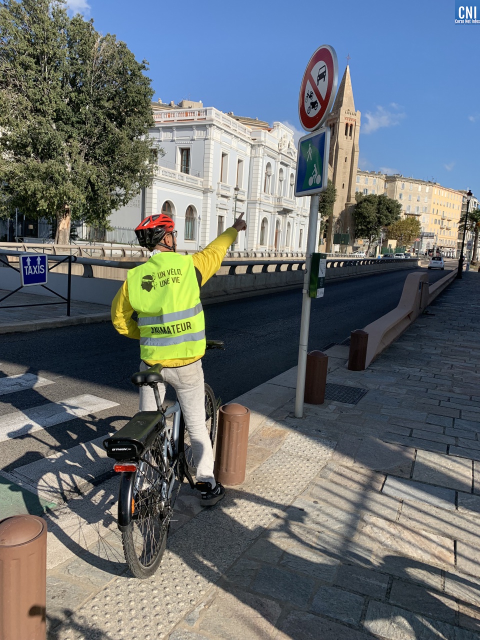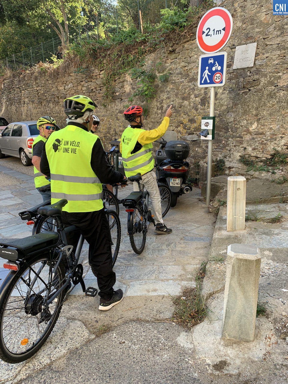 L’animateur décrit le tracé mais aussi les principaux panneaux que nous découvrirons au cours de notre escapade d’une heure 45. Panneaux et tracés au sol. Mairie de Bastia et Communauté d’Agglomération de Bastia ont aujourd’hui balisé 15 km à travers la ville.