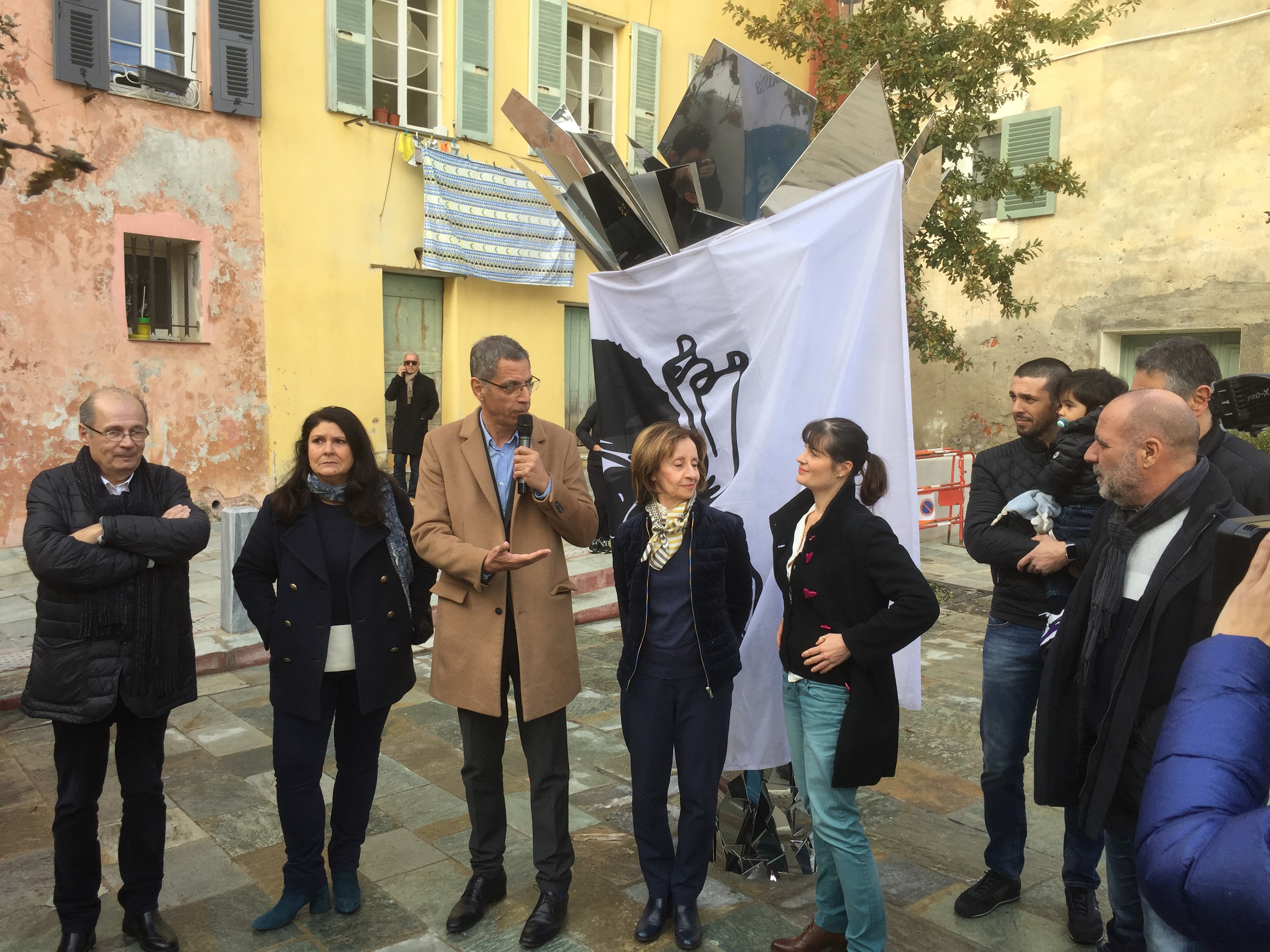 Le maire de Bastia, Pierre Savelli, entouré de ses adjoints et de l'artiste Jeanne de Petriconi (à droite) a dévoilé l'oeuvre d'art qui trône au milieu de la Place de l'ancien lavoir
