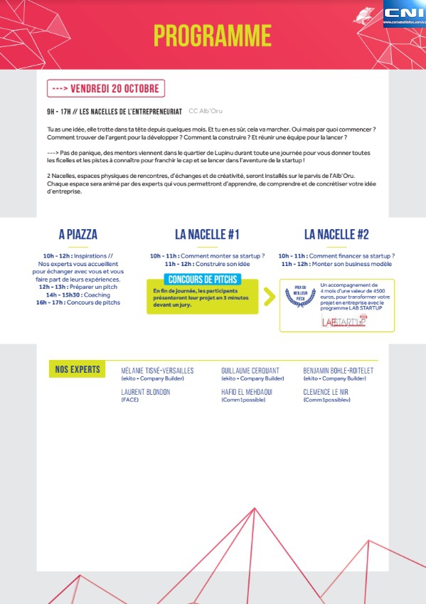 Celles-ci porteront sur différents thèmes tel que : la vie des startups, les financements, comment lancer son projet avec les bons moyens et les bonnes bases. Elles permettront aussi de découvrir les itinéraires d’entrepreneurs, l’innovation dans les quartiers…