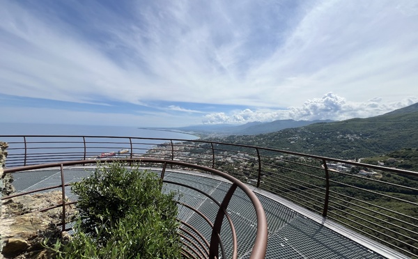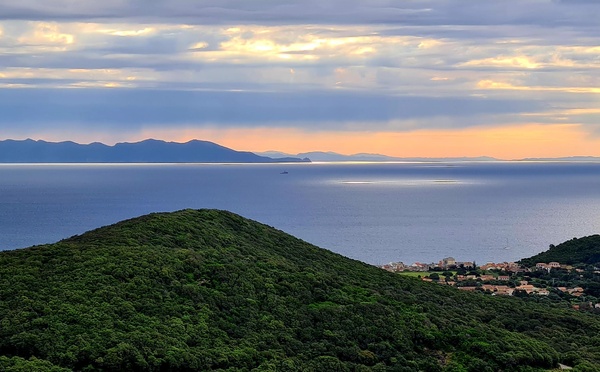 Depuis les hauteurs du Cap Corse, ce panorama où la Corse regarde vers l’Italie, fixé par Gérard Audoin, permet de situer au premier plan, le village de Macinaghju, lové entre mer et maquis, à l’horizon, l’île italienne de Capraia se détachant dans la lumière...