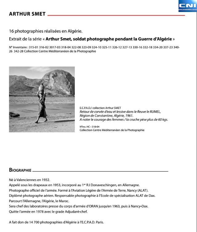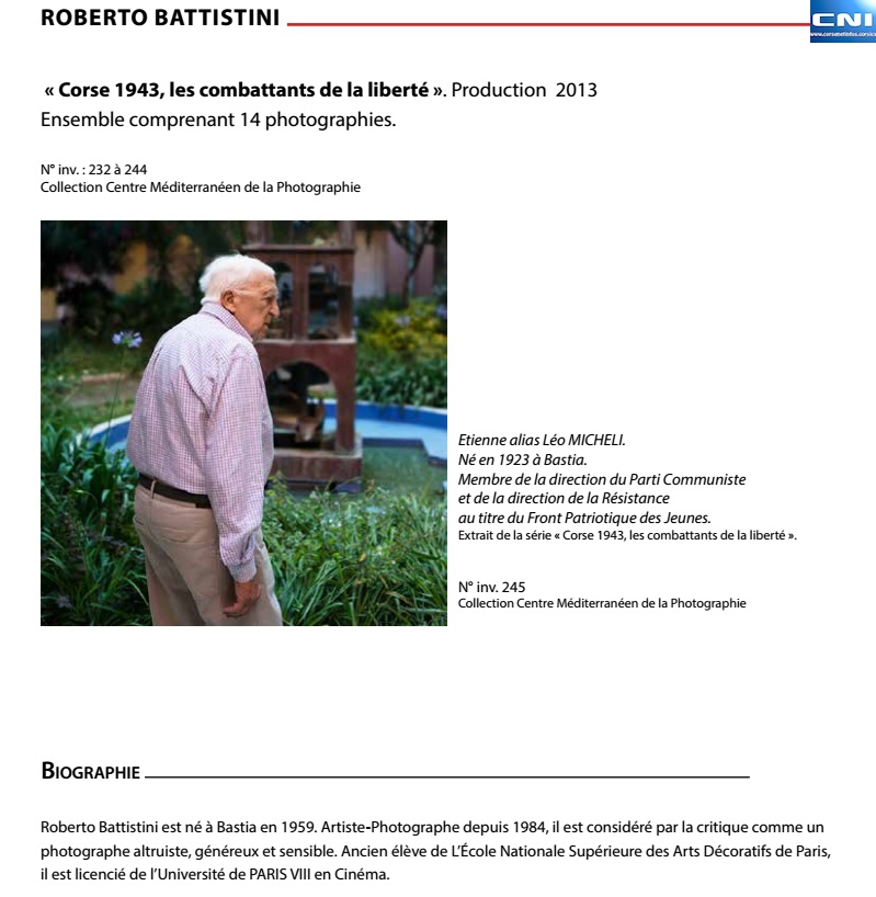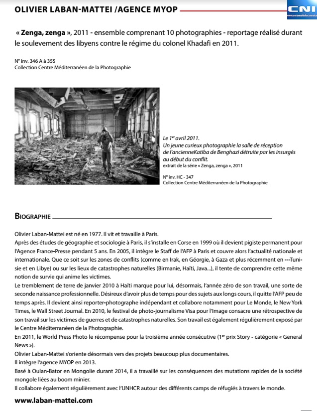 Ainsi, il est possible de découvrir les photographies de Roberto Battistini qui ont pour objet un travail de mémoire associant des paysages corses de la résistance aux acteurs de ces combats pendant la 2nde Guerre Mondiale, les photographies d’Olivier Laban-Mattei qui mettent en avant le soulèvement des rebelles de Benghazi en 2011, qui prirent les armes contre le régime de Kadhafi et, pour finir, les photographies d’Arthur Smet qui montrent la guerre d’Algérie vue par un soldat photographe