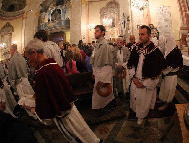 Ce rituel, pratiqué par le prêtre, fut renouvelé par les confrères de Saint Erasme et suivie, à la fin de l'Office, par la bénédiction des canistrelli.