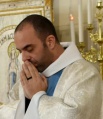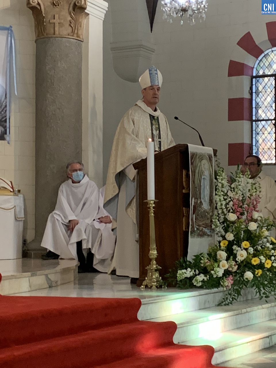 Mgr François Bustillo, évêque d’Ajaccio pour la Corse. devant la statue de la Vierge