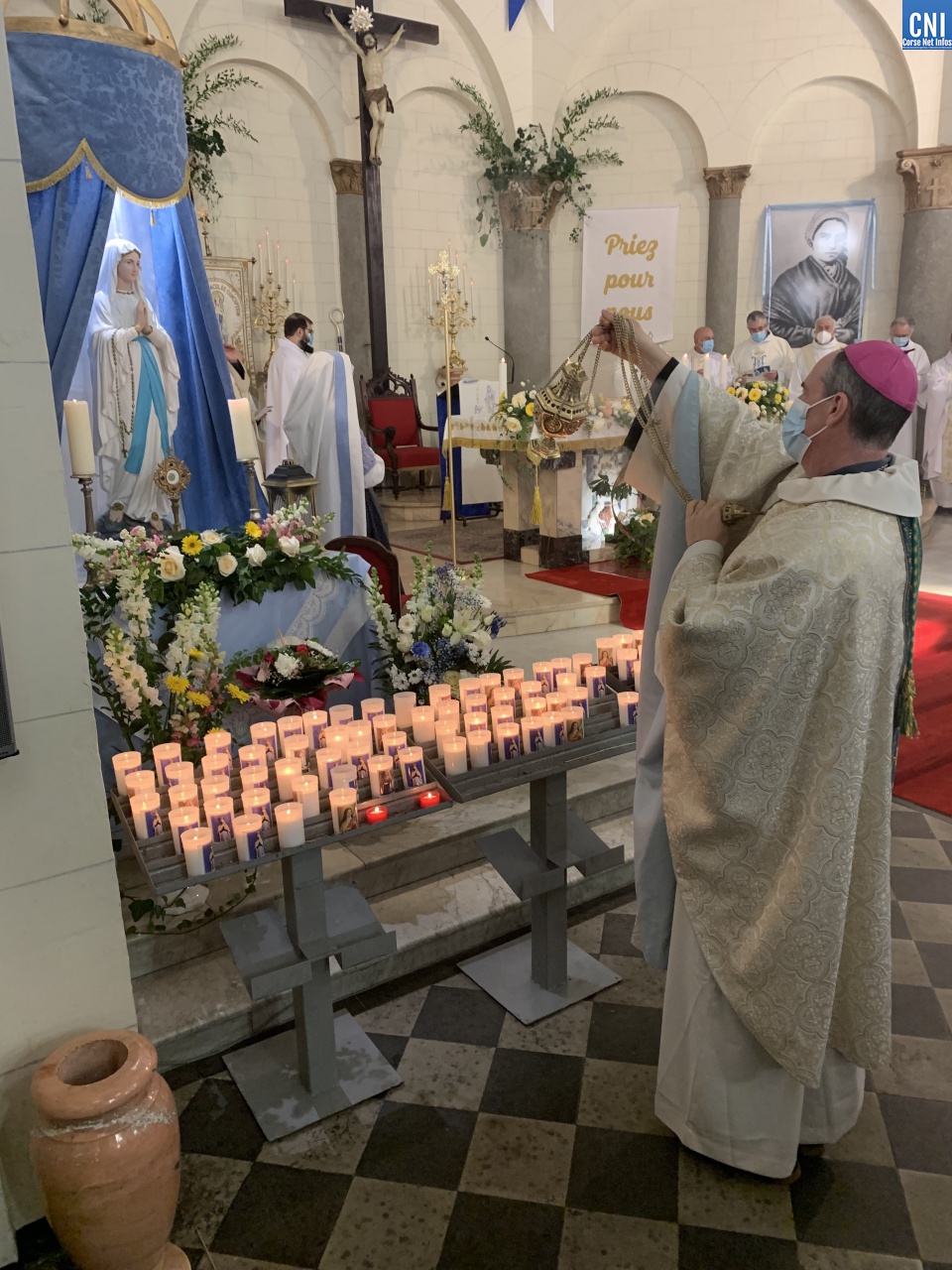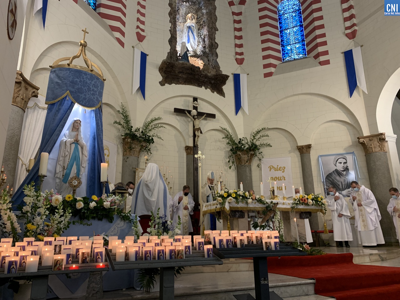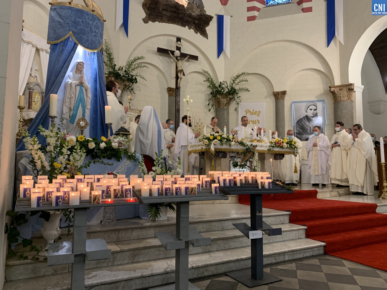 « C’est un moment important pour la vie de la paroisse, la vie du territoire, c’est un jour de mémoire » enchainait Mgr Bustillo. « Nous célébrons une vision, une apparition qui a changé la vie d’une jeune fille, Bernadette. C’est une belle fête, une fête émotionnelle. Lourdes séduit, Lourdes guérit cœur et âme. Il y a deux aspects dans cette fête : Marie nous invite à la conversion et à la confiance. On voit parfois dans la conversion une dimension triste, volontariste et c’est dur et compliqué alors que c’est un moment heureux qui tend vers le vivre meilleur. L’apparition de la Vierge est une présence discrète et efficace. Marie apparait pour apporter à l’humanité du courage. Elle nous dit – Je suis là et je vous accompagne. Sa présence maternelle doit nous rassurer. Marie est aussi la femme de la confiance. Une présence douce et fidèle qui nous rassurent. Elle est à Lourdes, elle est à Bastia, elle est ailleurs. ND de Lourdes intercède par cette paroisse, par cette ville, par la Corse. On lui demande fécondation, vocation, communion et joie ».