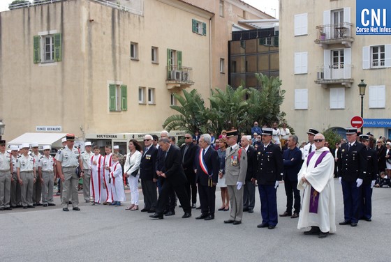 Les autorités, au premier rang desquelles le Maire de Calvi, Ange Santini, ceint de son écharpe tricolore, entouré du Colonel Christophe de La Chapelle, chef de Corps du 2e REP de Calvi, Frédéric Guglielmi, secrétaire général de la Sous-préfecture de Calvi, Jean-Louis Delpoux, adjoint au Maire de Calvi, conseiller territorial, Marie Luciani, Sylvie Berereni, Pancrace Guglielmacci, Didier Bicchieray, Jean-Michel Nobili, adjoints au maire de Calvi, Laurent Guerini, conseiller municipal de Calvi, Claude Deceuninck, Président de l'association des Anciens Combattants Calvi-Balagne accompagné de Gracieuse Rochault, le chef de bataillon Paulo de Carvalho, commandant la Compagnie de Gendarmerie de Calvi, entouré de ses adjoints le lieutenant Alain Chupau, commandant la Communauté de Brigades de Calvi-Balagne et du Major Stéphane Samadet, commandant la Brigade de Gendarmerie de Calvi. le Commandant Stéphane Orticoni, commandant le Centre de Secours et d'Intervention de Calvi, Michel Nadal, Directeur Général des Services de la Ville de Calvi, Jeanine Maraninchi, responsable de la section Balagne de la Ligue contre le cancer....