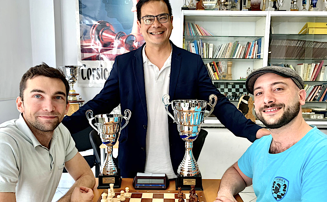 Jean-Michel Bigonnet, vice-champion de Corse 2024 (à gauche), Akkha Vilaisarn, président de la Ligue Corse des Echecs et Pierre-Louis Pieri, champion de Corse 2024 (Photo Ligue corse d'Échecs)
