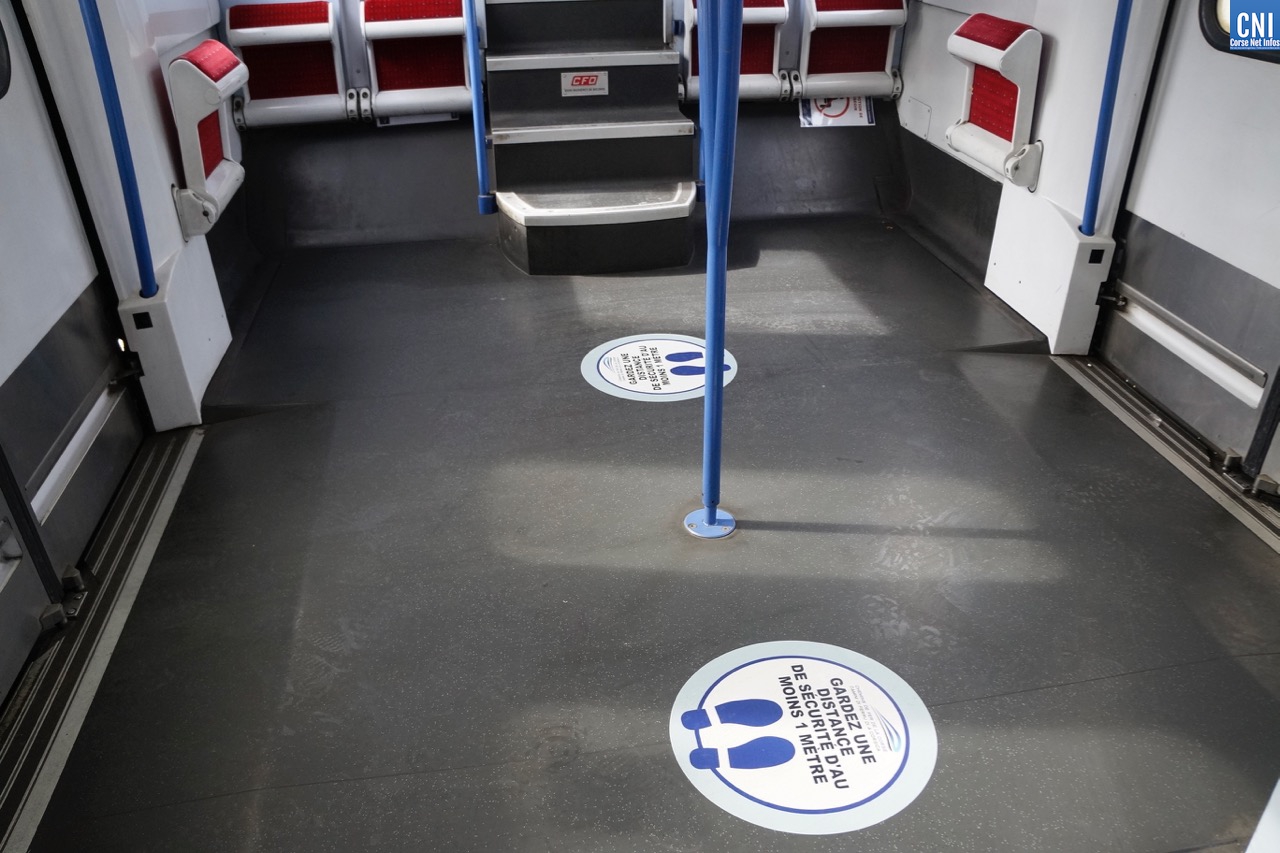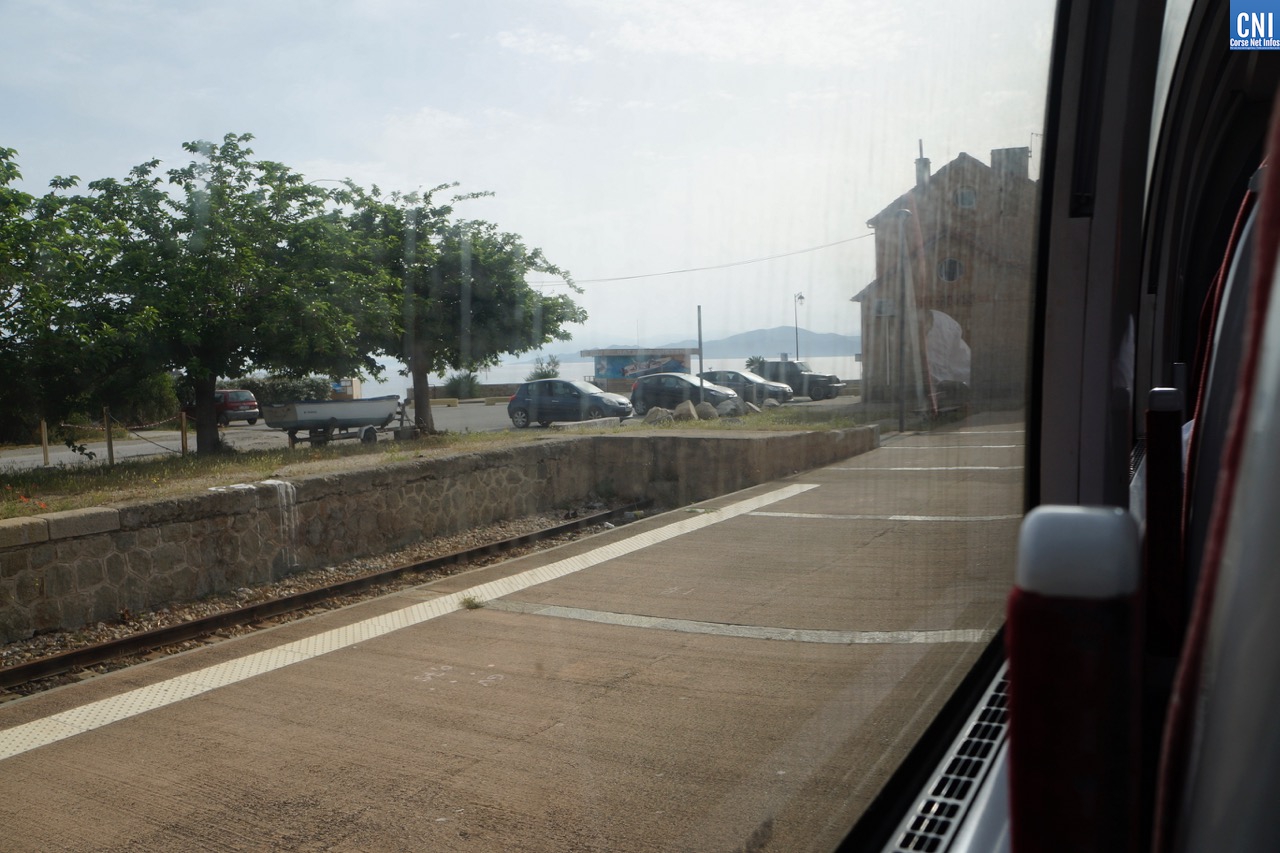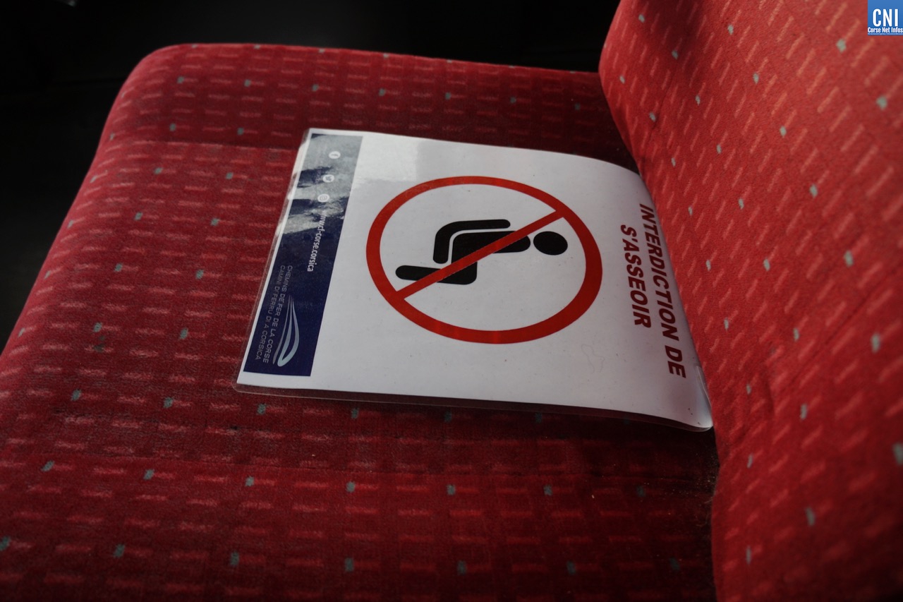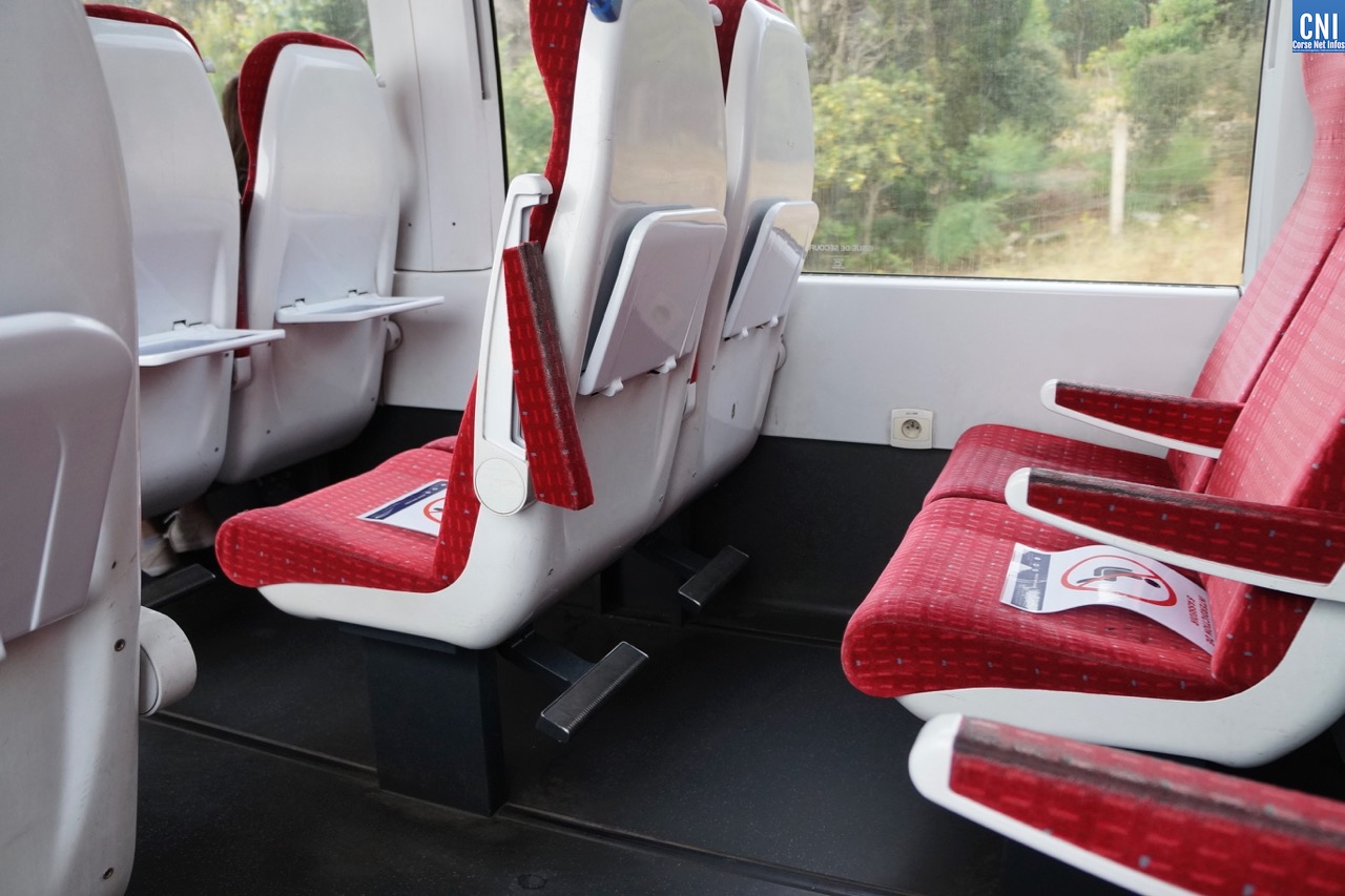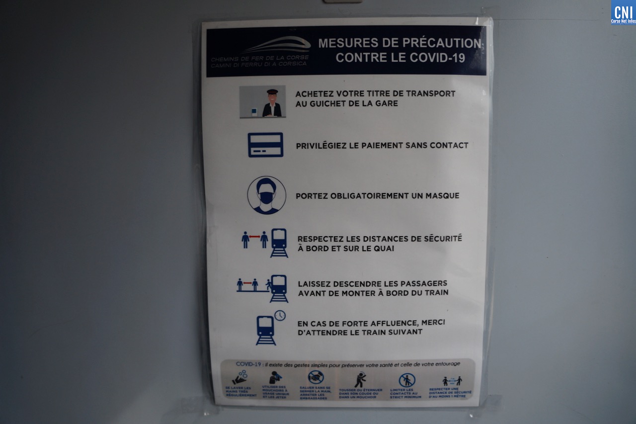 Hier matin, lundi, le train, prévu à 8h09, est à l’heure. Il arrive dans cette gare déserte, le conducteur et le contrôleur à l’avant, masques sur le visage. Le contrôleur vient ouvrir la porte et précise qu’il ne peut encaisser le ticket en liquide : « On verra en gare d’Île Rousse » nous dit-il. En effet, dès la montée, un panneau informatif liste les nouvelles règles à respecter pour cause de COVID19 parmi lesquelles l’obligation d’acheter son ticket en gare. « Des gestes simples pour préserver votre santé et celle de votre entourage » précise l’affichette comme le port obligatoire du masque, le respect des distances de sécurité à bord et sur le quai. Une des consignes interroge forcément : « En cas de forte affluence, merci d’attendre le train suivant. » On est à bord du train Calvi/Bastia n°100CA qui circule tous les jours sauf le dimanche et qui est le seul et unique de la journée ! Mieux vaut ne pas le manquer.