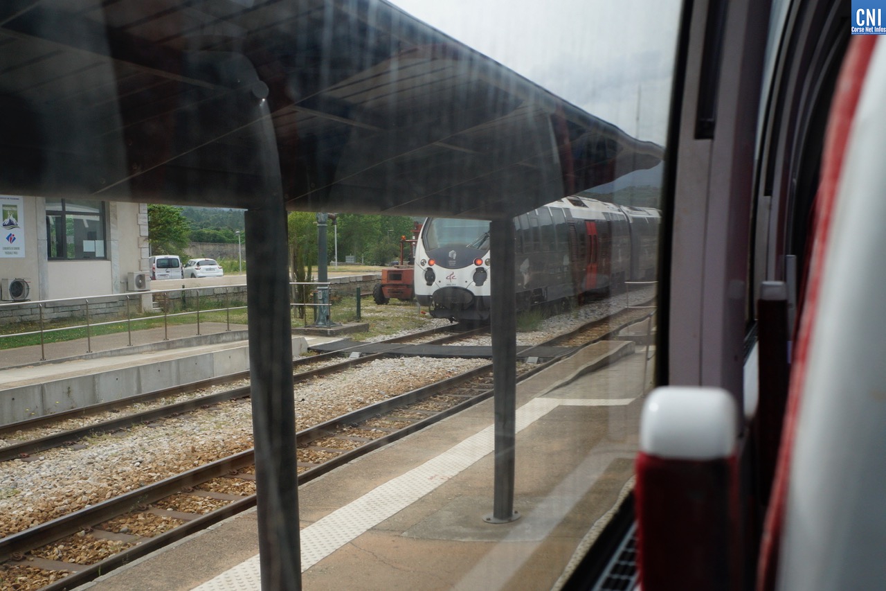 Vu la fréquence et le monde, pas de changement de train à Ponte Leccia. On croise juste celui qui repart vers Ajaccio et un peu plus de monde sur le quai.