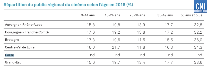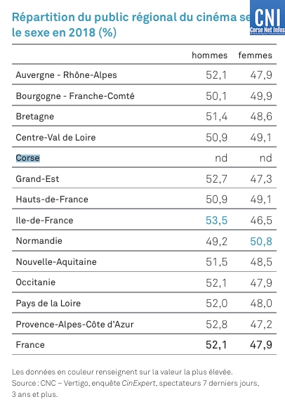 Autre paradoxe, le CNC annonce que « en 2018, les Corses sont allés en moyenne 2 fois au cinéma avec un taux d’occupation des fauteuils de 17 %, ce qui représente le plus haut niveau de l’ensemble des régions françaises » et, dans le même temps que « l'indice de fréquentation est plus fort en Ile-de-France (4,24 entrées par habitant sur l’année), en Provence-Alpes-Côte-D’azur (3,45) […] C’est en Corse (1,97) que l’indice de fréquentation est le plus faible. » Il faudrait savoir…