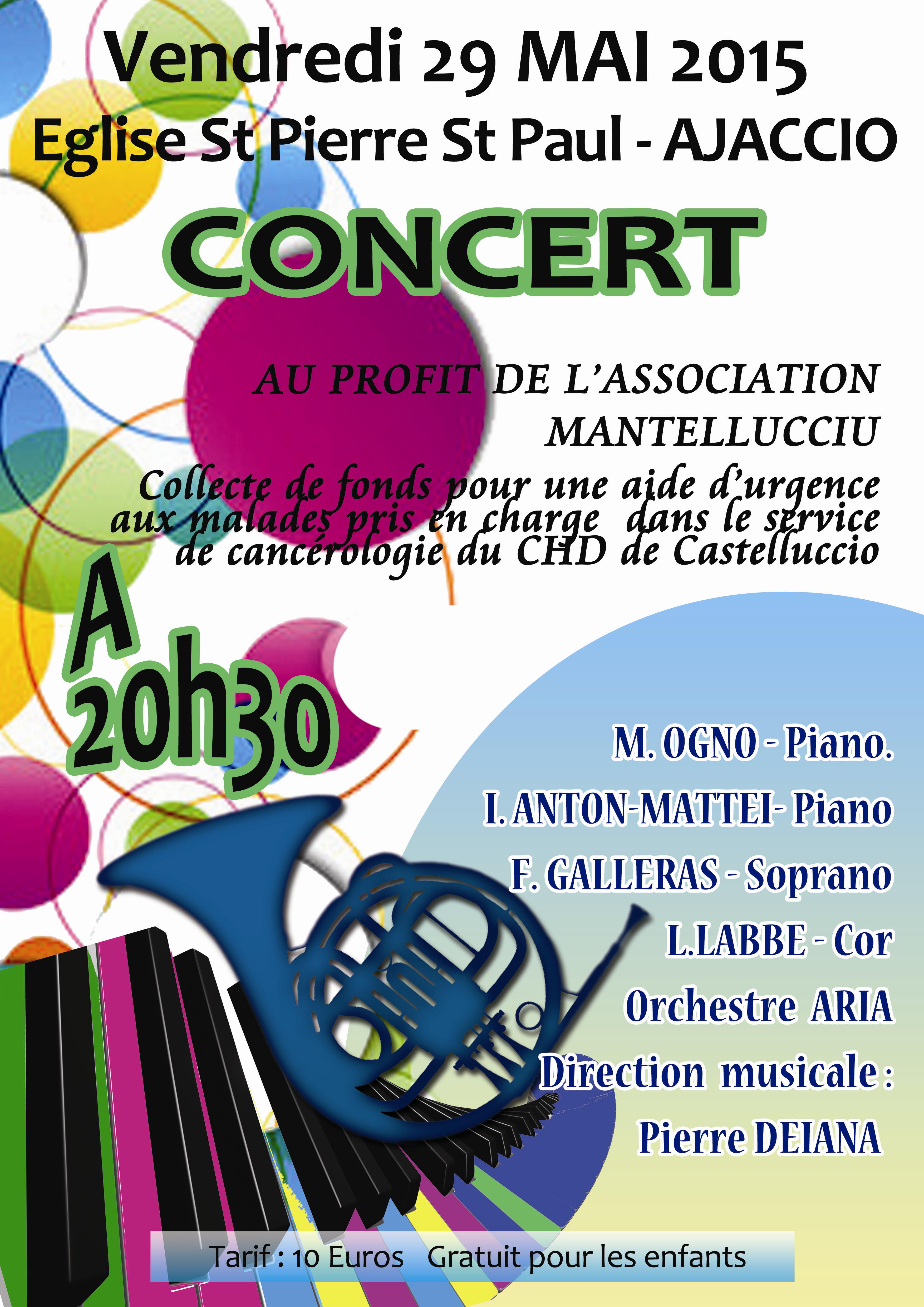 Un concert aura lieu le Vendredi 29 mai à 20h30 à l’Eglise Saint Pierre Saint Paul dont tous les bénéfices seront reversés à l’association Mantellucciu qui apporte une aide financière d’urgence aux malades hospitalisés en oncologie au Pavillon Alivu.