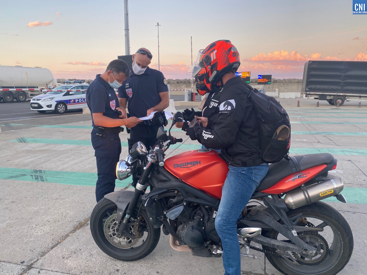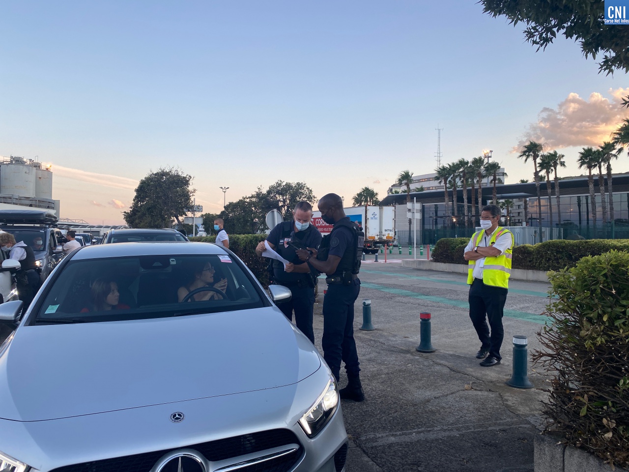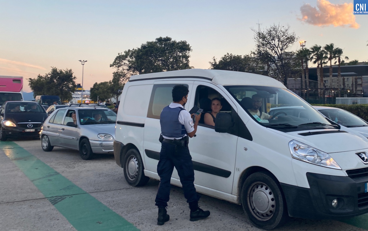 Il est 20h30 et le vent souffle fort sur le port de Bastia, le bateau en provenance de Nice qui devait arriver à 20 heures a du retard ce jeudi 8 juillet. A 20h45, les premières voitures descendent du navire. C'est la délivrance pour les 1 002 passagers. Après avoir avancé une cinquantaine de mètres en direction de la sortie, Loïc et Delphine sont vites coupés dans leur lancée. "Contrôles de pass sanitaire", lance une jeune policière masquée. Le conducteur baisse la vitre et comprend qu'il faut récupérer les QR codes. La policière les scanne sous l'œil attentif du préfet de Haute-Corse, François Ravier, placé quelques mètres en arrière. "Tout est bon, vous pouvez y aller. Bonne vacances". Loïc et Delphine, venus d'Ile-de-France vont pouvoir rejoindre leur lieu de vacances sereinement.