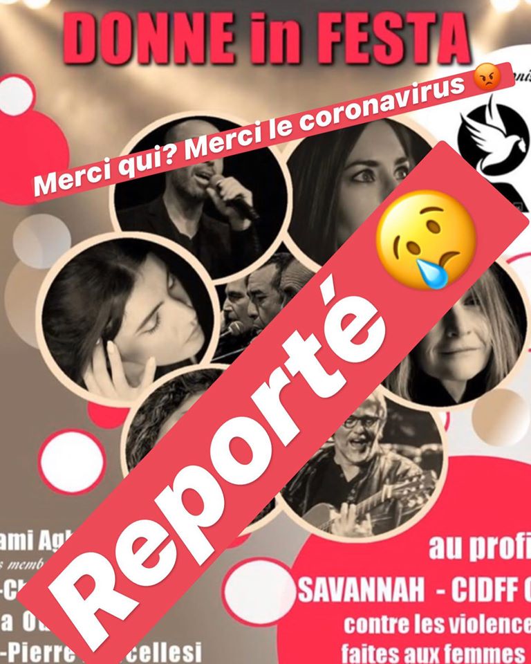 Le collectif "Donne e Surelle", qui avait mis sur pied un concert festif ce vendredi 6 Mars au profit des associations qui luttent contre les violences faites aux femmes et France Alzheimer, a reporté la soirée qui devait se dérouler au Palatinu en raison de l'épidémie de Coronavirus. Sur sa page Facebook le collectif précise : "Hélas nous sommes dans l’obligation de reporter l’événement #donneinfesta