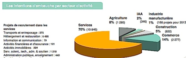 A noter encore que 42% des intentions d’embauche de la région sont jugées difficiles par les employeurs en 2013 : Près de six projets sur dix sont considérés comme problématiques dans la construction, un sur deux dans l'hôtellerie-restauration, la santé humaine et l'action sociale.