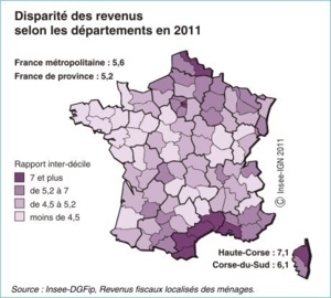 Dans son étude il souligne encore que : "la Corse se caractérise par un écart important entre les revenus les plus faibles et les plus élevés. En 2011, les 10 % de ménages les plus aisés ont des revenus 6,6 fois supérieurs aux 10 % de ménages les plus modestes. Ce rapport est tiré à la hausse par les bas revenus. A titre de comparaison, il n'est que de 5,2 en moyenne de province. Cependant, les disparités se sont réduites en Corse au cours des dernières années alors qu'elles sont restées stables au niveau national. Les mécanismes de redistribution (ensemble des ressources et déduction faite des impôts et prélèvements sociaux) constituent les principaux instruments de lutte contre la précarité monétaire. Ainsi, après redistribution cette disparité est réduite à 3,6 dans la région."