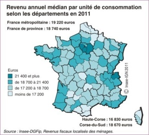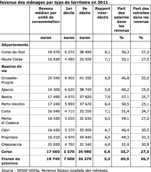 On peut y lire que "la Corse est l'une des régions françaises où les revenus sont les plus faibles. En 2011, la moitié des ménages y a un revenu annuel inférieur à 17 700 euros. Ce niveau de revenu place l'île parmi les trois dernières régions françaises devant le Nord-Pas-de-Calais et le Languedoc-Roussillon. Ainsi, en Corse, un habitant sur cinq vit sous le seuil de pauvreté en 2010, avec un niveau de vie inférieur à 924 euros mensuel. Cette proportion s'établit à un habitant sur sept en moyenne de province."