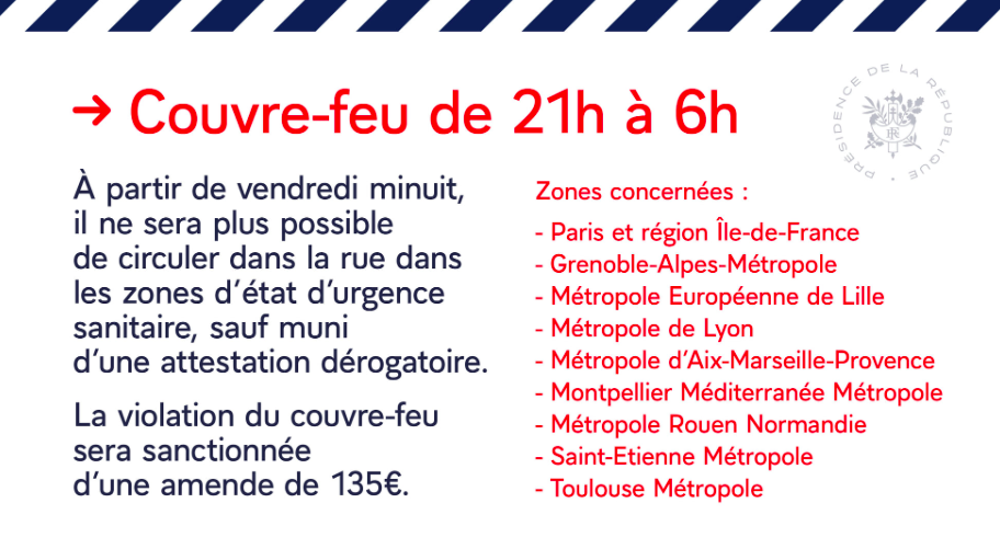 - Un couvre-feu d'au moins 4 semaines en Ile-de-France et à Lille, Rouen, Saint-Etienne, Toulouse, Lyon, Grenoble, Aix et Montpellier. Il y aura des contrôles et des amendes de 135 euros, 1500 euros en cas de récidive.