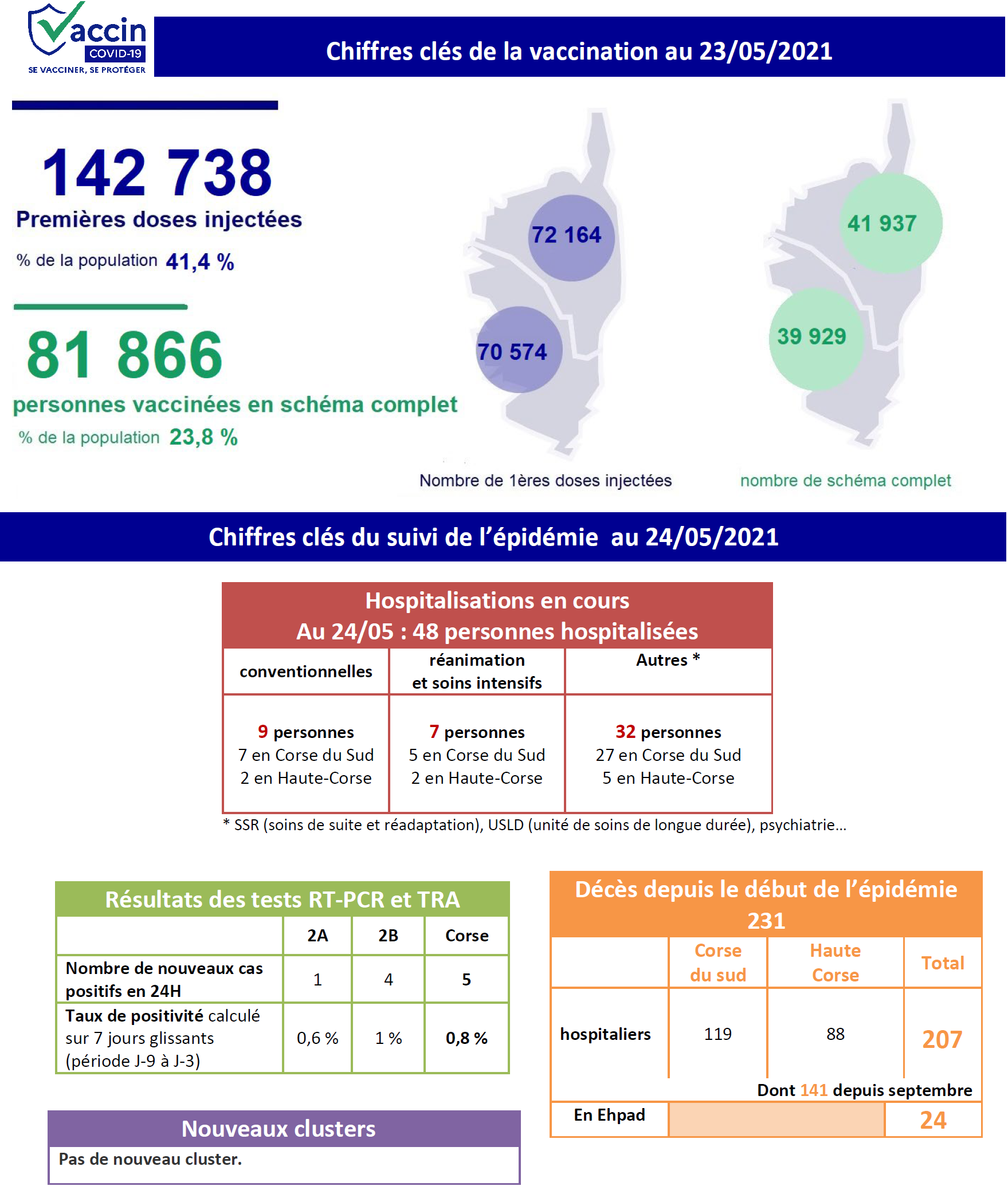 Les chiffres de l'épidémie, communiqués quotidiennement par l'agence régionale de la Santé, sont demeurés stables lors des dernières 24 heures. Il y a toujours autant de personnes hospitalisées à Bastia et à Ajaccio - 48 dont 7 en réanimation ou soins intensifs - le nombre de nouveaux cas positifs aux test RT-PCR et TRA se limitent à 5 en ce lundi 24 mai 2021et le taux de positivité est toujours très bas (0,8%). La lutte contre la Covid-19, via la vaccination; se poursuit néanmoins. 142 738 premières doses ont désormais été injectées et 81 866 personnes ont reçu les deux.