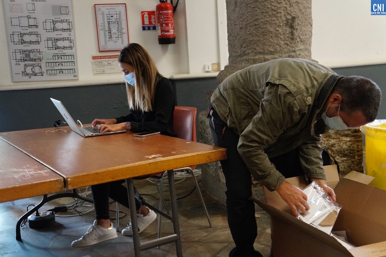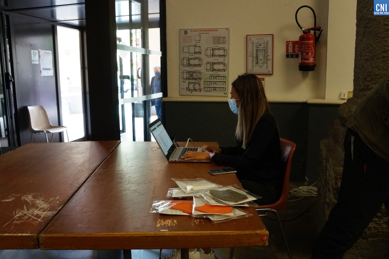 La jeune femme, derrière son ordinateur, tient son listing à jour : « Nous avons distribué près de 500 masques ici depuis ce matin et 340 sur le site de l’Alb’oru » précise-t-elle. Son collègue enchaîne : « Nous avons vu beaucoup de monde, c’est un peu plus calme mais il y a eu une forte affluence en début de matinée. Ça s’est ralenti vers midi. Peu de temps après le passage du maire et du directeur général des services qui sont venus nous saluer et nous soutenir vers 11 heures. »