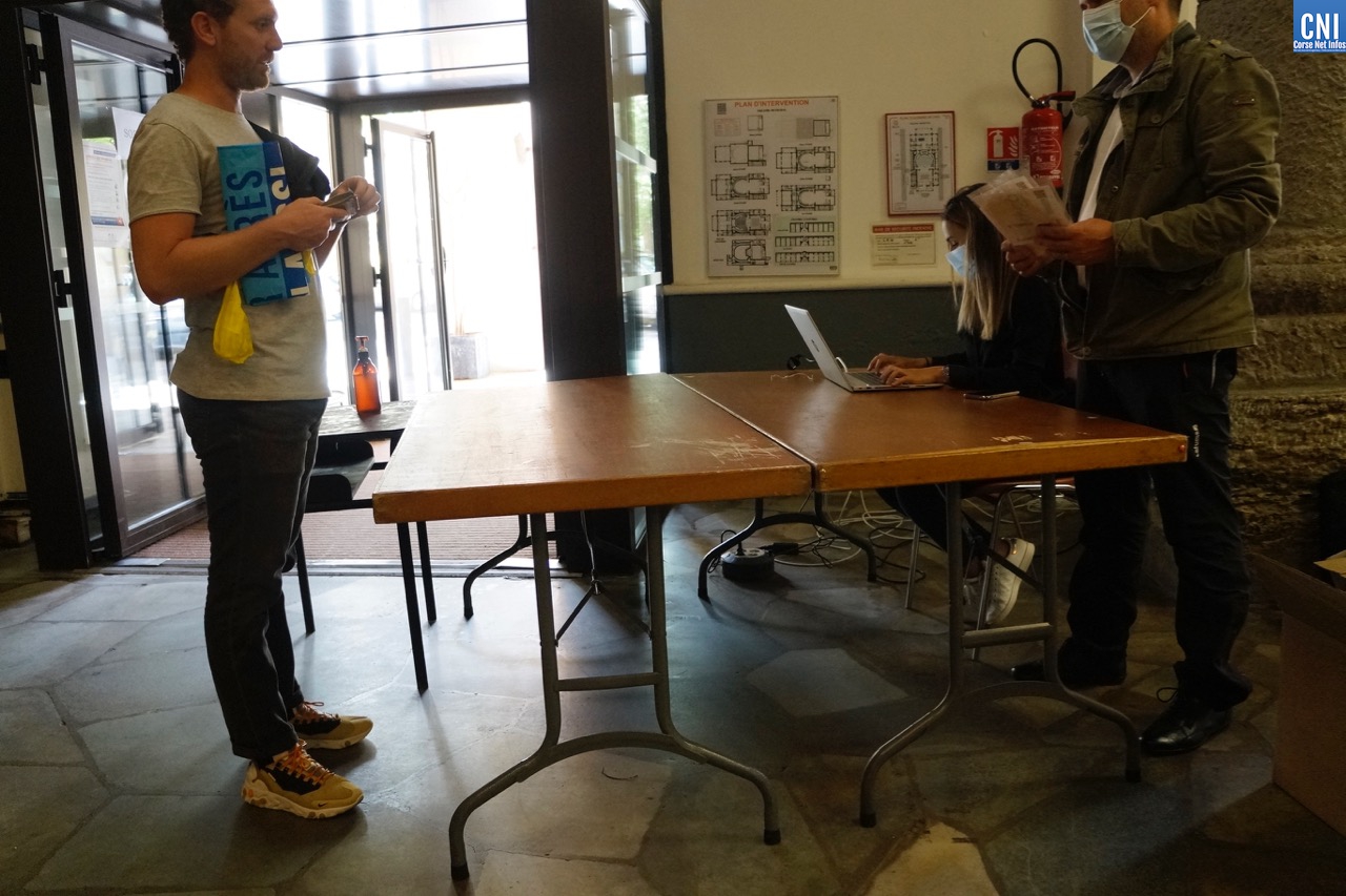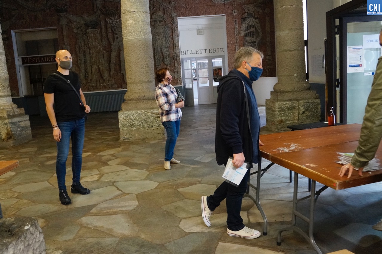 Une équipe de trois personnes, Aade, Régis et Stéphane sont là pour accueillir le public ce mercredi dans le théâtre, ouvert pour l’occasion. Ils délivrent des masques aux habitants de Bastia n'ayant pas encore bénéficié de la distribution au public prioritaire par la Ville et son CCAS. Il est 14h30, ils ont commencé à 8 heures le matin.