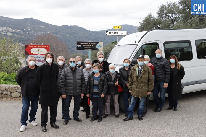 Le ciel est relativement gris mais la température est douce. Au rond-point de l'école et du village d'Aregno, le Maire David Calassa et son adjointe en charge des affaires sociales sont là, devant le minibus pour accueillir à 13h30 les personnes âgées de la commune qui n'ont pas de moyens de locomotion pour se rendre au centre anti-Covid du Centre Hospitalier Calvi - Balagne.