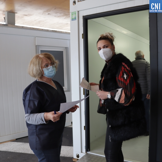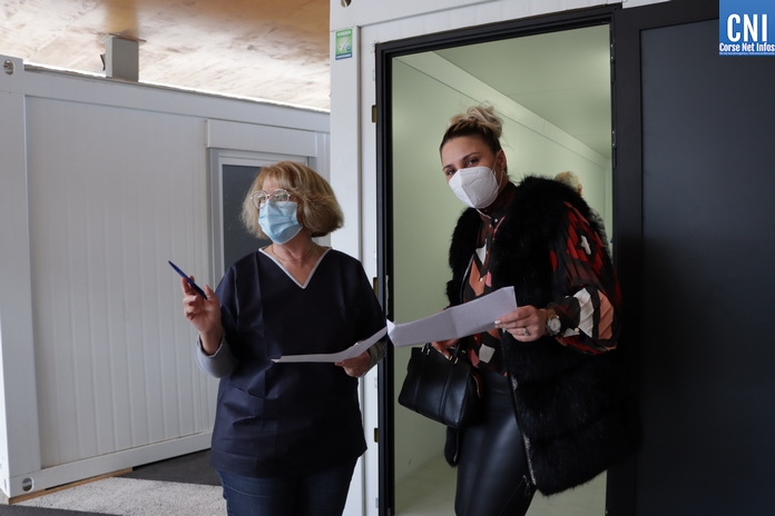 A l'arrivée du minibus au Centre Hospitalier Calvi-Balagne où un bâtiment de type "Algéco" sert de Centre Anti-Codid, Élodie Carlotti est présente pour vérifier avec l'infirmière Marie-Paule que tout soit en ordre, avant que le Dr Roche, qui se veut rassurant, ne procède à la première injection de ce vaccin Pfizer.