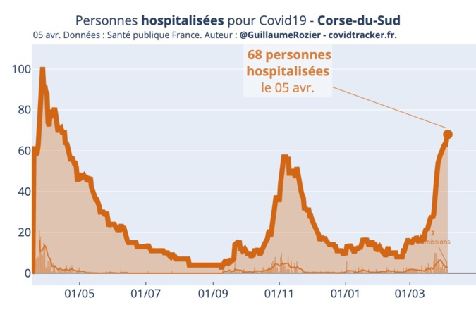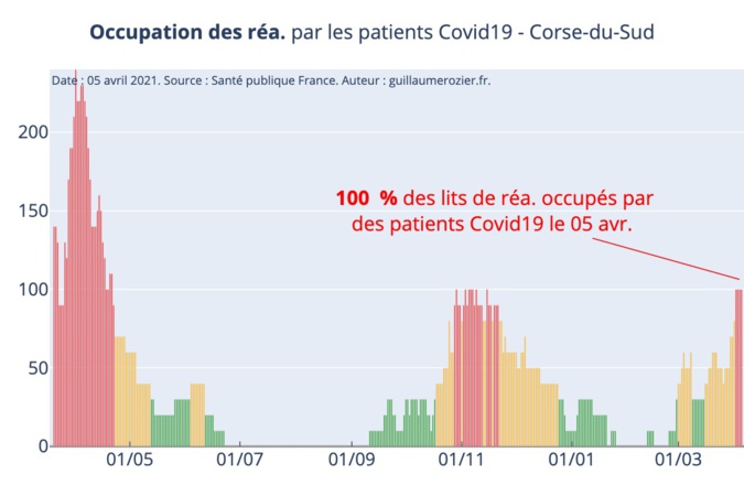 En effet, au 5 avril, 68 personnes étaient hospitalisées en Corse-du-Sud pour COVID-19, selon les données de Santé Publique France - les chiffres du jour n'ayant pas encore été rendus publics. De même, toujours selon les données de Santé Publique France, au 5 avril, 100% des lits de réanimation sont occupés par des patients COVID.