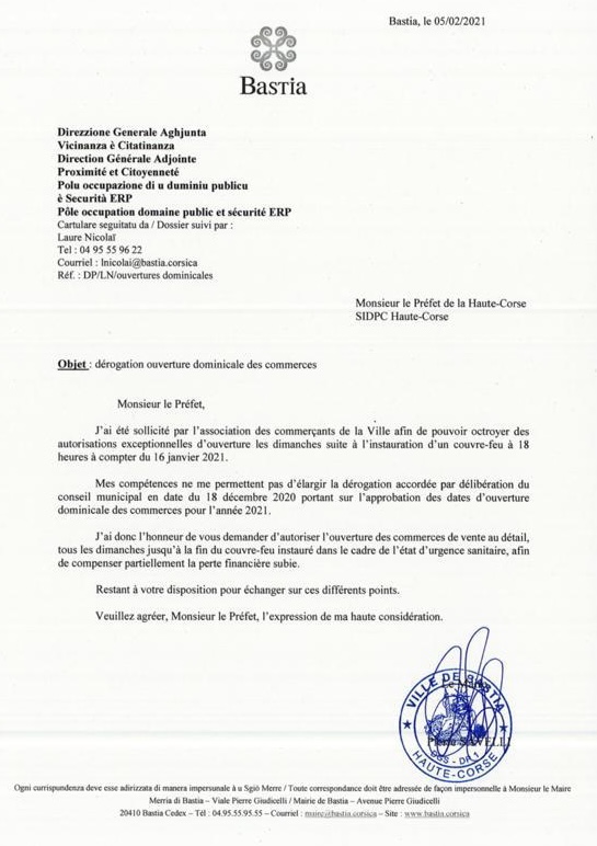 Après s’être entretenu avec l'association des commerçants bastiais, le maire de Bastia, Pierre Savelli, demande, par courrier envoyé le 5 février, au préfet de la Haute-Corse d’autoriser les commerces de détail à ouvrir le dimanche. Le but est d’aider les commerçants bastiais à compenser les pertes liées aux mesures sanitaires et au couvre-feu à 18 heures.