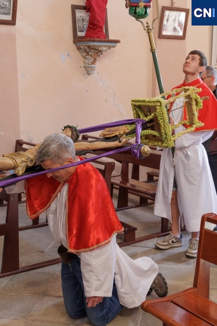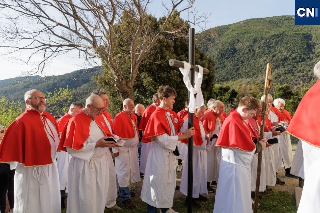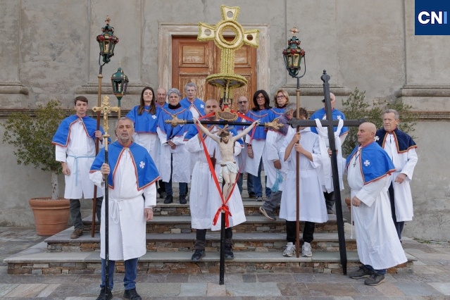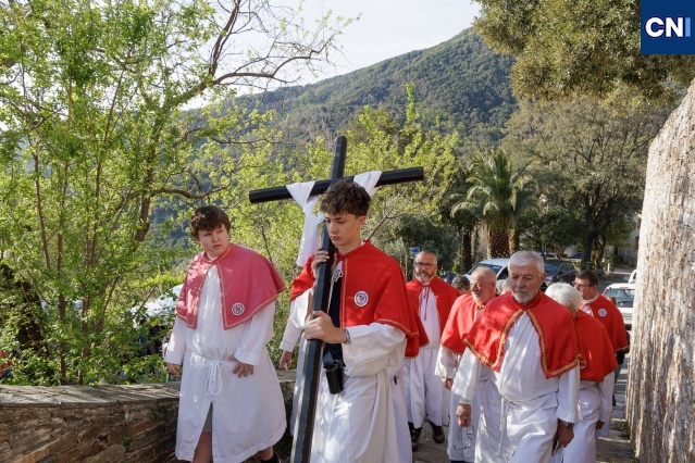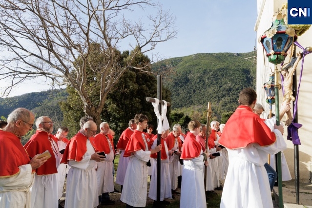 Les croix se font face. Les trois confréries s’arrêtent. Figarella ici. San Martino un peu plus loin. Et Mandriale plus tard. Il y a comme une suspension. Puis les chants - les lodi sacri - montent, se répondent, s’entremêlent. Ce n’est ni une confrontation ni une simple rencontre : c’est un hommage. Un salut ancien, précis, transmis sans avoir besoin d’être expliqué.